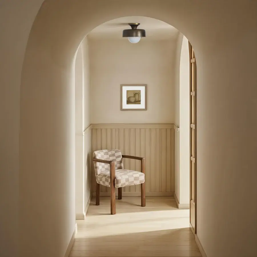 The Flare flush mount transforms any ceiling into an opportunity to make a modern statement. Its aged brass cast-aluminum frame is sleek and sculptural, while the etched glass globe adds subtle texture. Perfect for contemporary or minimalist interiors, this fixture delivers refined, architectural presence, turning a simple light source into a striking design element.