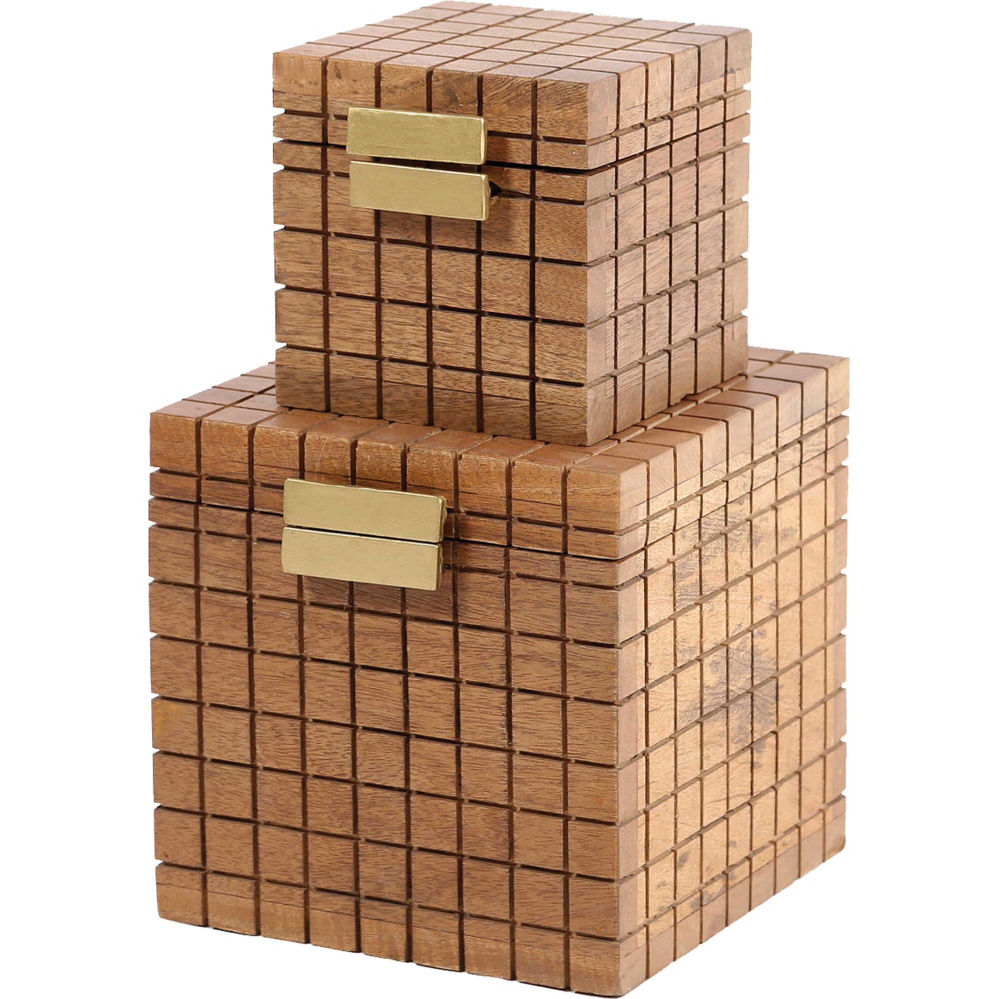 Set Of Two - Box - Mango Wood - Carved - Natural Finish - Iron Antique Brass Plated Finish