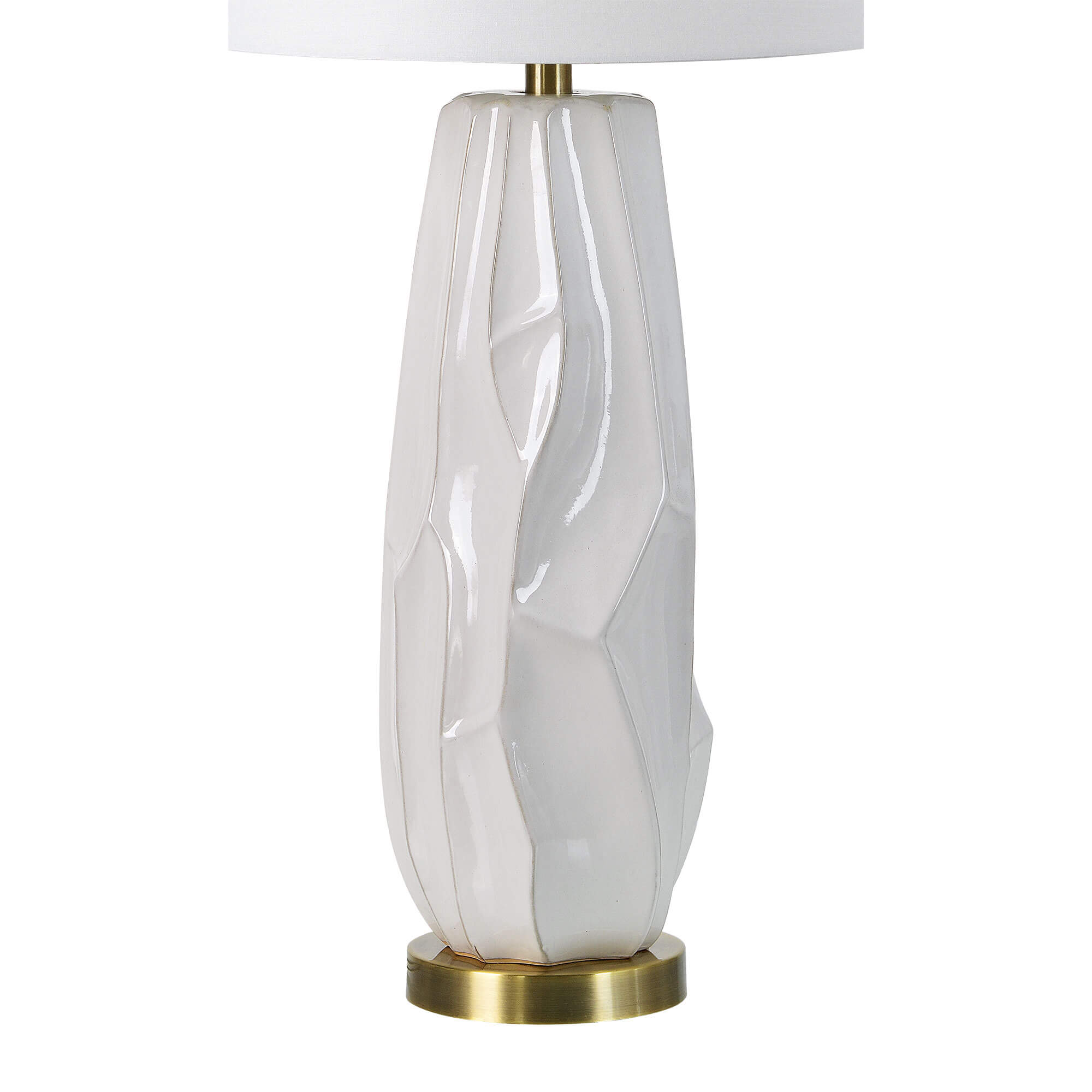 The modern living space is elevated architecturally through this table lamp design. A client who desires the appearance of sculpture in their ceramic table lamp design will consider this piece a perfect match. The bright appearance of the lamp and shade and the warmth of the antique brushed brass details lend an air of glamour and simplicity to the room it is set within.