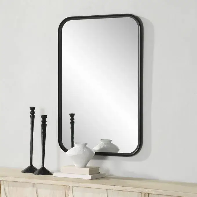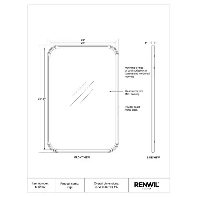 Softly rounded corners make the stylish Kaja mirror stand out from the crowd. Constructed with a lightweight yet sturdy aluminum frame, hanging this wall art mirror is easy. Plus, its 2-way D-ring hanging system lets you display the mirror either vertically or horizontally wherever you want. A matte black powder-coated frame holds clear mirrored glass that provides a distortion-free reflection that’s only available to high-quality mirrors like this one. Well-suited to decorating styles from mid-century modern to rustic farmhouse and everything in between, this is the perfect piece to add an updated touch to any space.