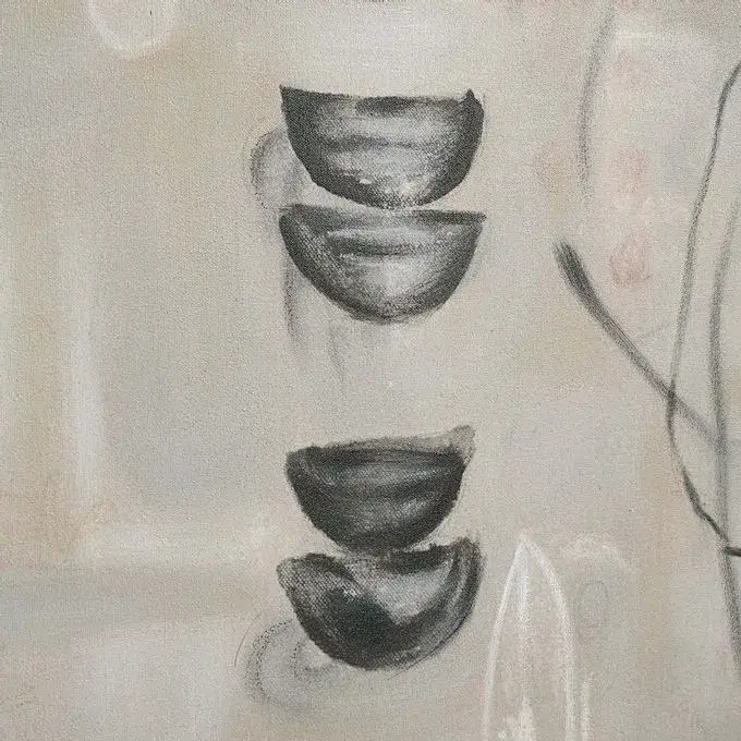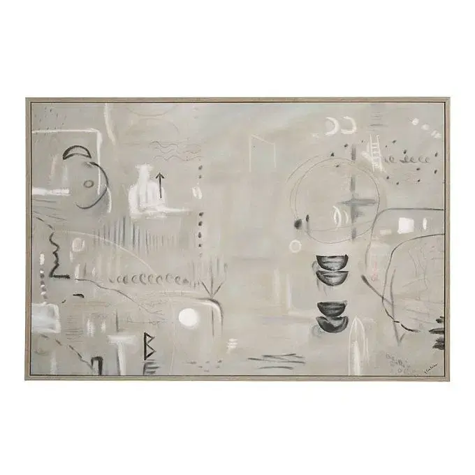 This abstract art painting allows every passerby to create their own narrative from its print details and brush strokes. In the home office or workplace, this canvas art sparks creativity without overpowering the space. The muted palette extends out to the light walnut frame, making placement within an interior an effortless process.