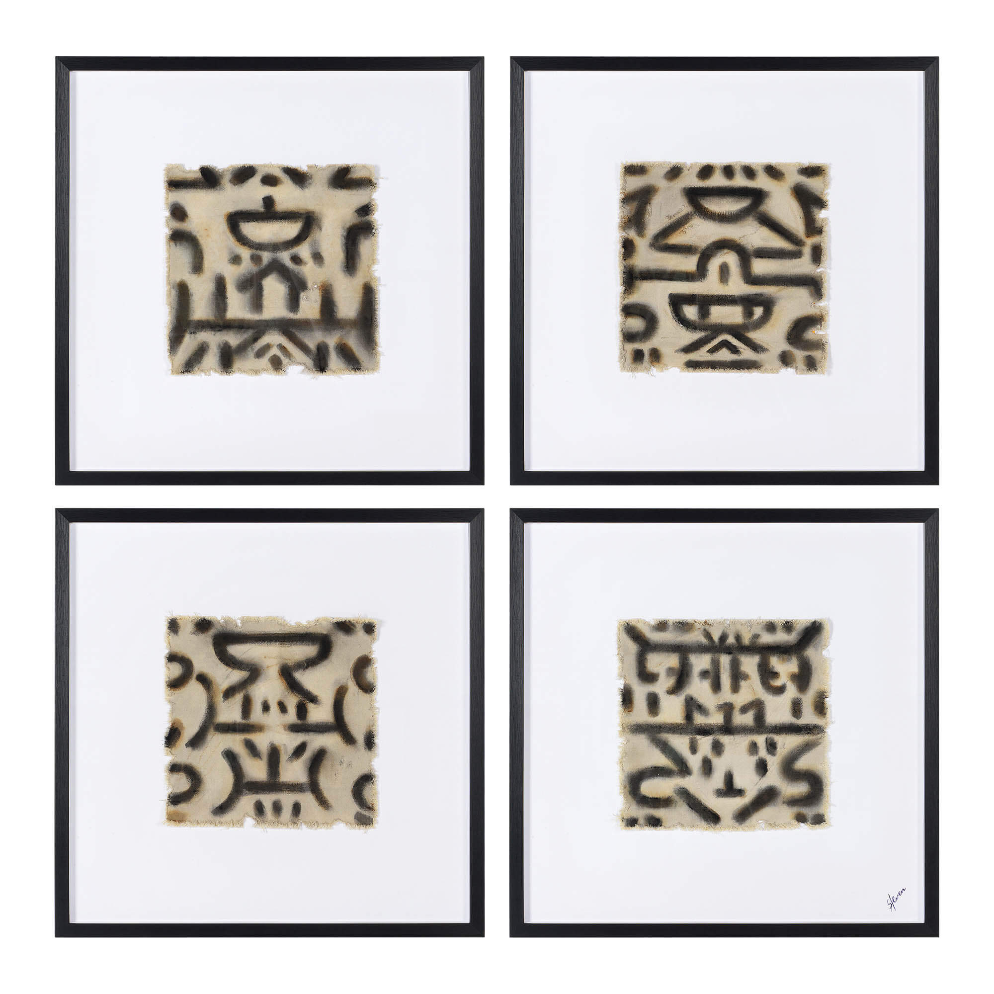 Archeological influences shine brightly from these four framed wall art designs. While each piece showcases a different arrangement, they all perfectly complement and contrast one another. Arranged amid wood and leather furnishings and details, the creative quality of these framed wall decor pieces is optimally enhanced.