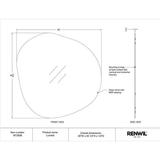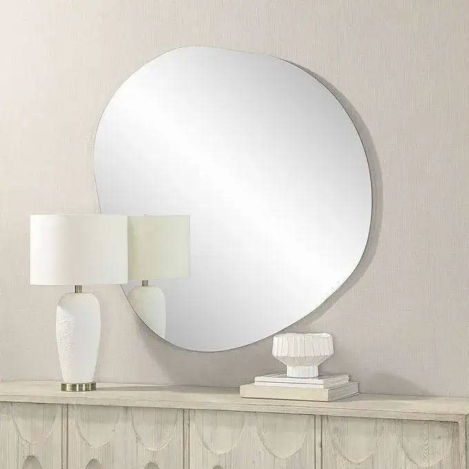 The Lunaria 45" Tall Irregular Round Mirror is a stunning addition to any modern home. Crafted from high-quality materials, it features a beautiful, elegant design that's both sleek and sophisticated. The mirror sits atop a sturdy frame, ensuring it is both durable and long-lasting. Equipped with a D-Ring hanging system, this mirror is easy to install and can be hung in any way you desire. Its four-way hanging capability provides versatile display options, making it an excellent choice for those seeking both style and functionality in their decor. Perfect for any room, the Lunaria mirror is a standout piece that's sure to impress.