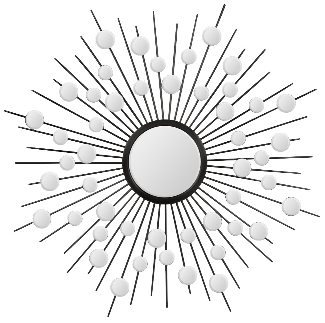 This round mirror's intricate design boasts elegant matte black rays, each with its own round mirror affixed. Perfect for adding interest to any space, this piece is sure to become the shining star of the room. Its sturdy iron construction ensures its durability, while its multiple angles and edges enhance its beauty.