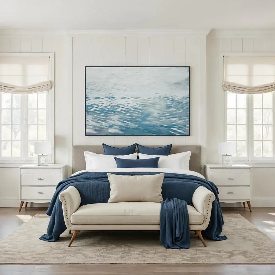 Large in scale yet soft in tone, the Merlo canvas art brings a peaceful vibe to any room. Created on premium cotton/linen, its calming blue shades, textured gel accents, and matte finish suit relaxed, casual interiors. Framed with a sleek light black wood floating frame, this ready-to-hang piece effortlessly combines tranquility with modern style.