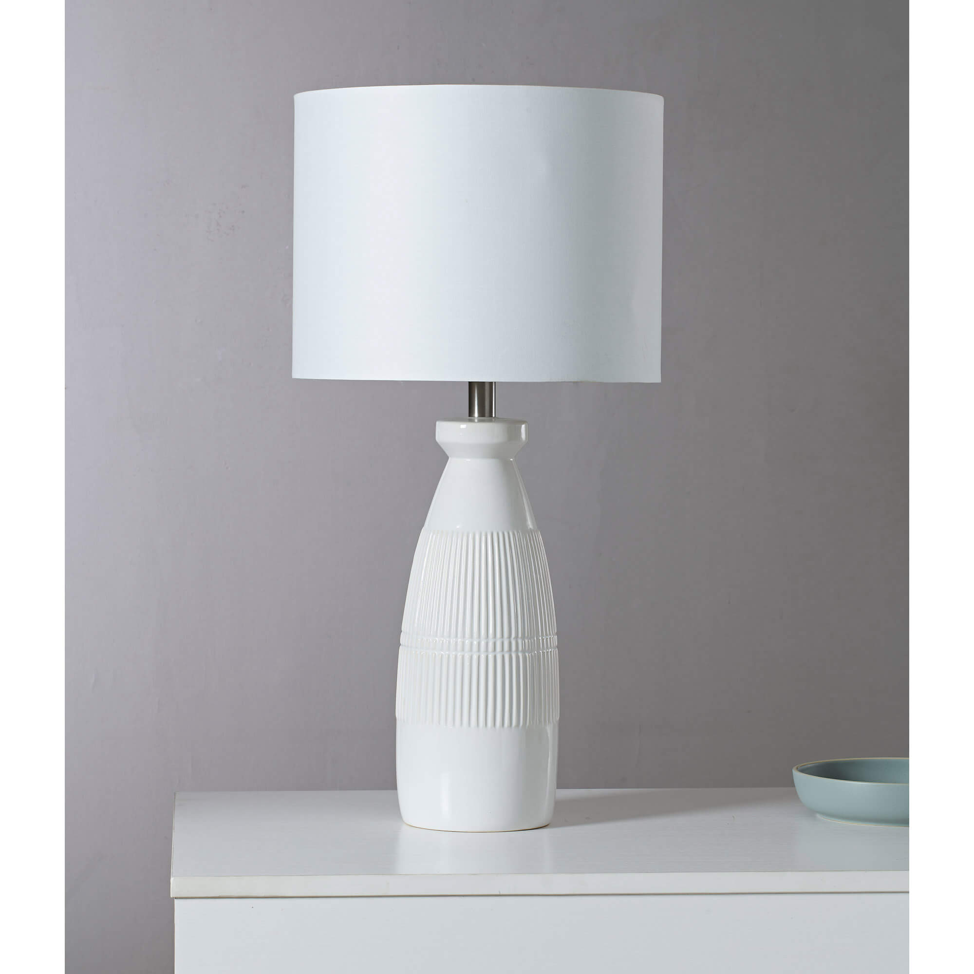 The classic interior takes on a smooth modern air when this lamp is cast in its midst. At 26.25 inches in height and 13 in width and depth, it holds grandeur in stature but also in style. The ceramic base features a gloss glaze finish with finely etched lines and is topped with an off-white cotton shade.