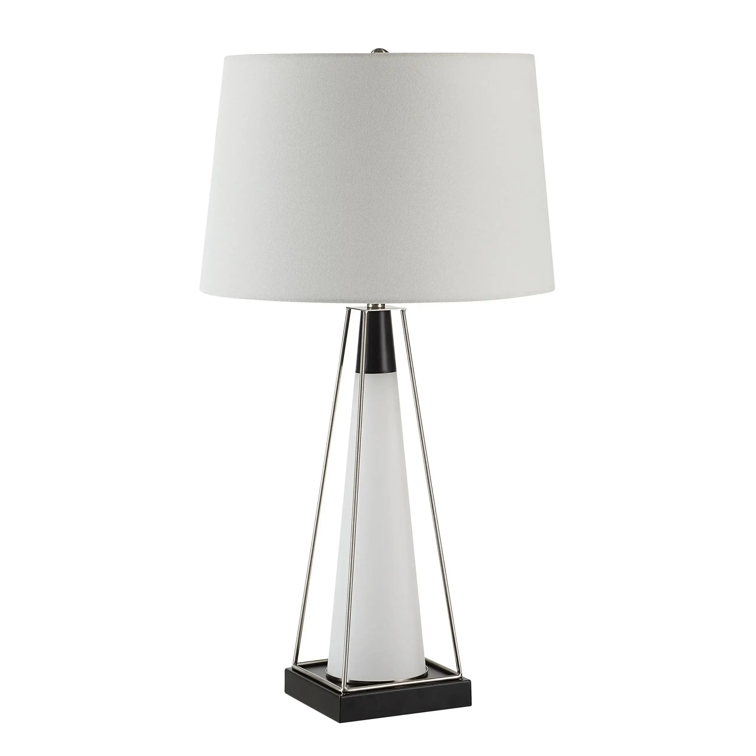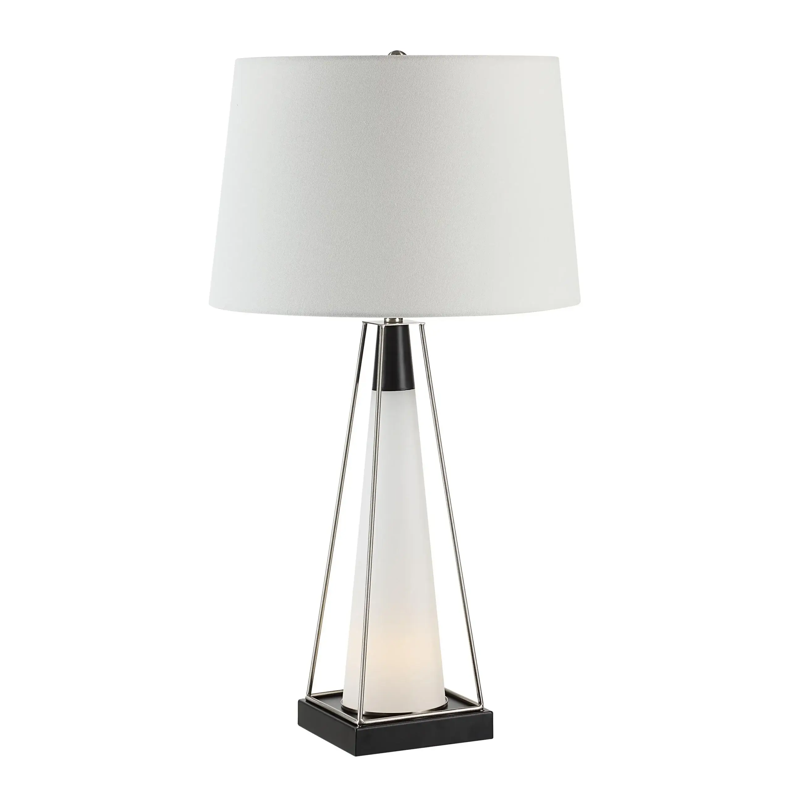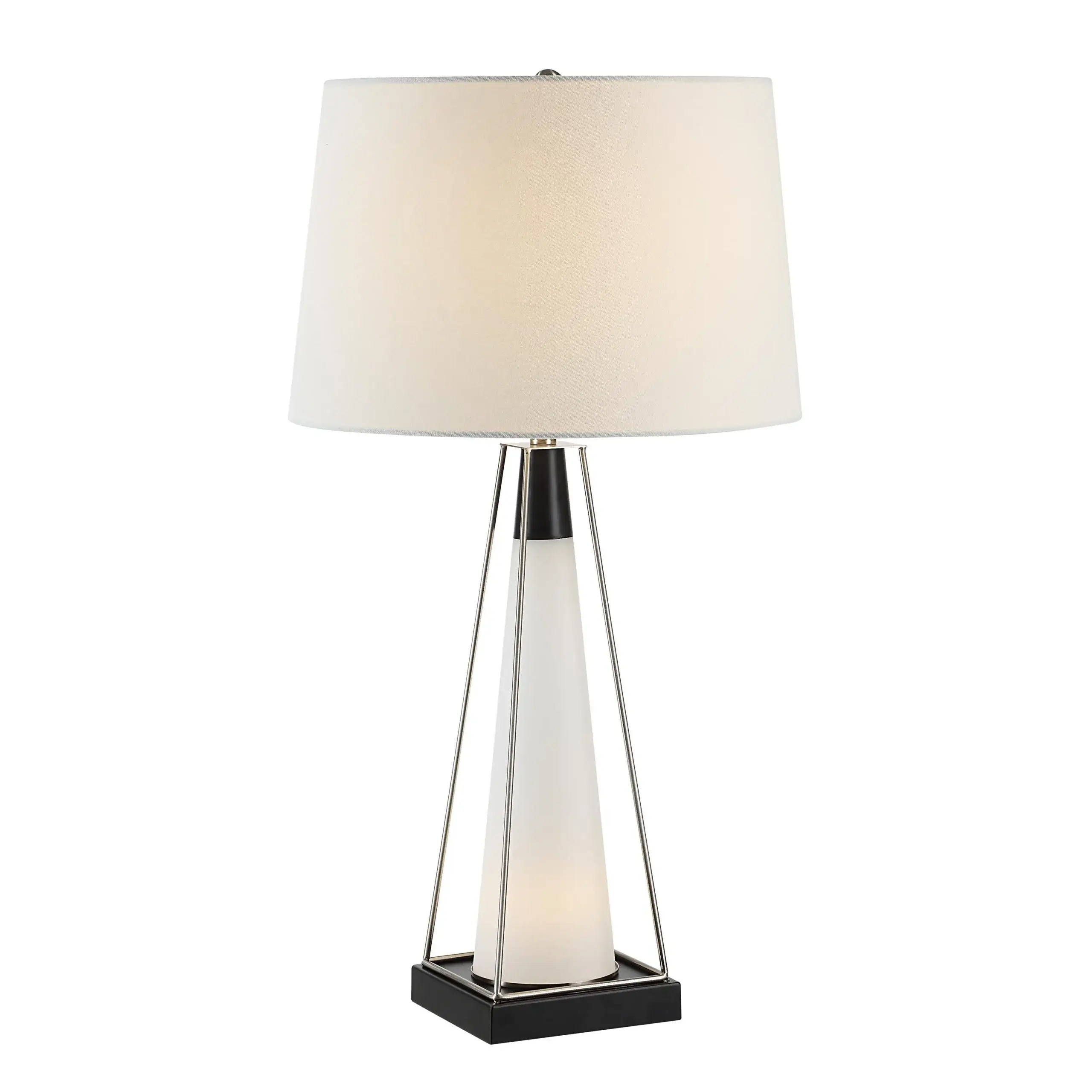 Innovation and contemporary design are on display in the Navagio lamp. Modern finishes come together in the perfect mix of frosted glass, brushed nickel, matte black and ivory linen to create a table lamp that’s as great-looking as it is effective. As a bonus, it even features a convenient night light in its base to light up any space with a soothing glow.