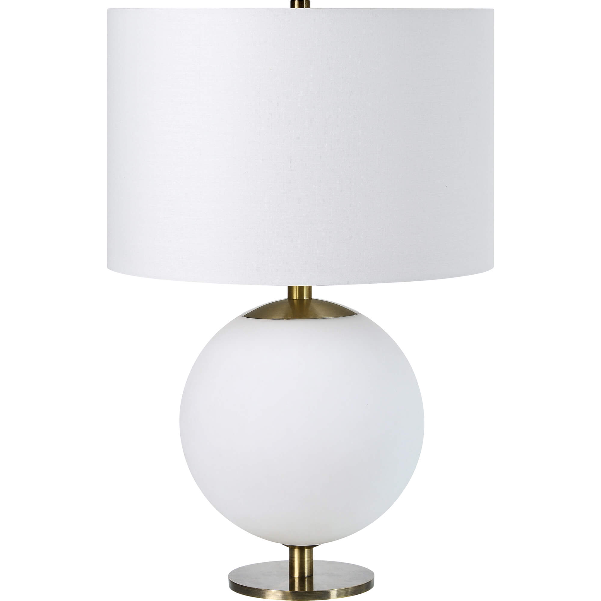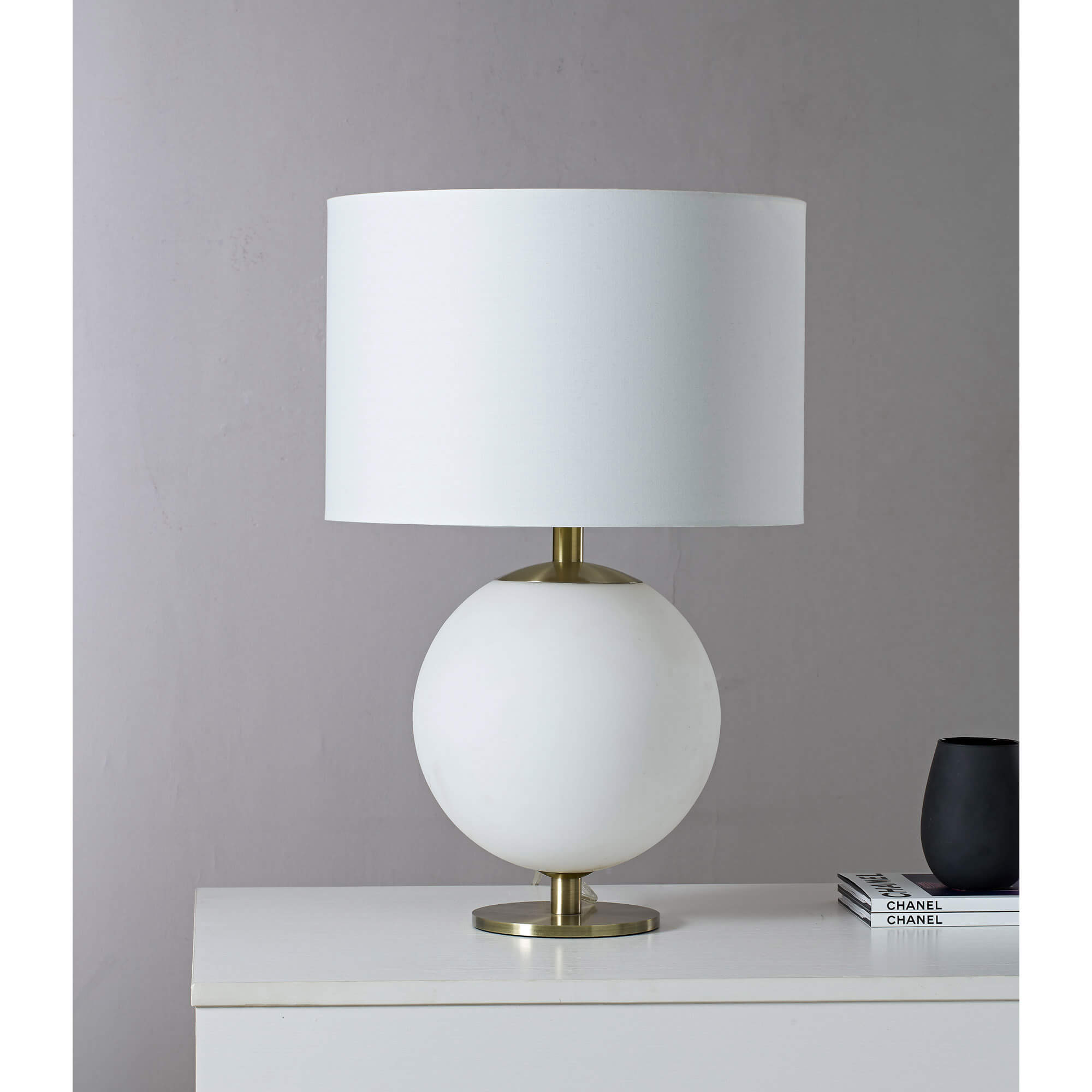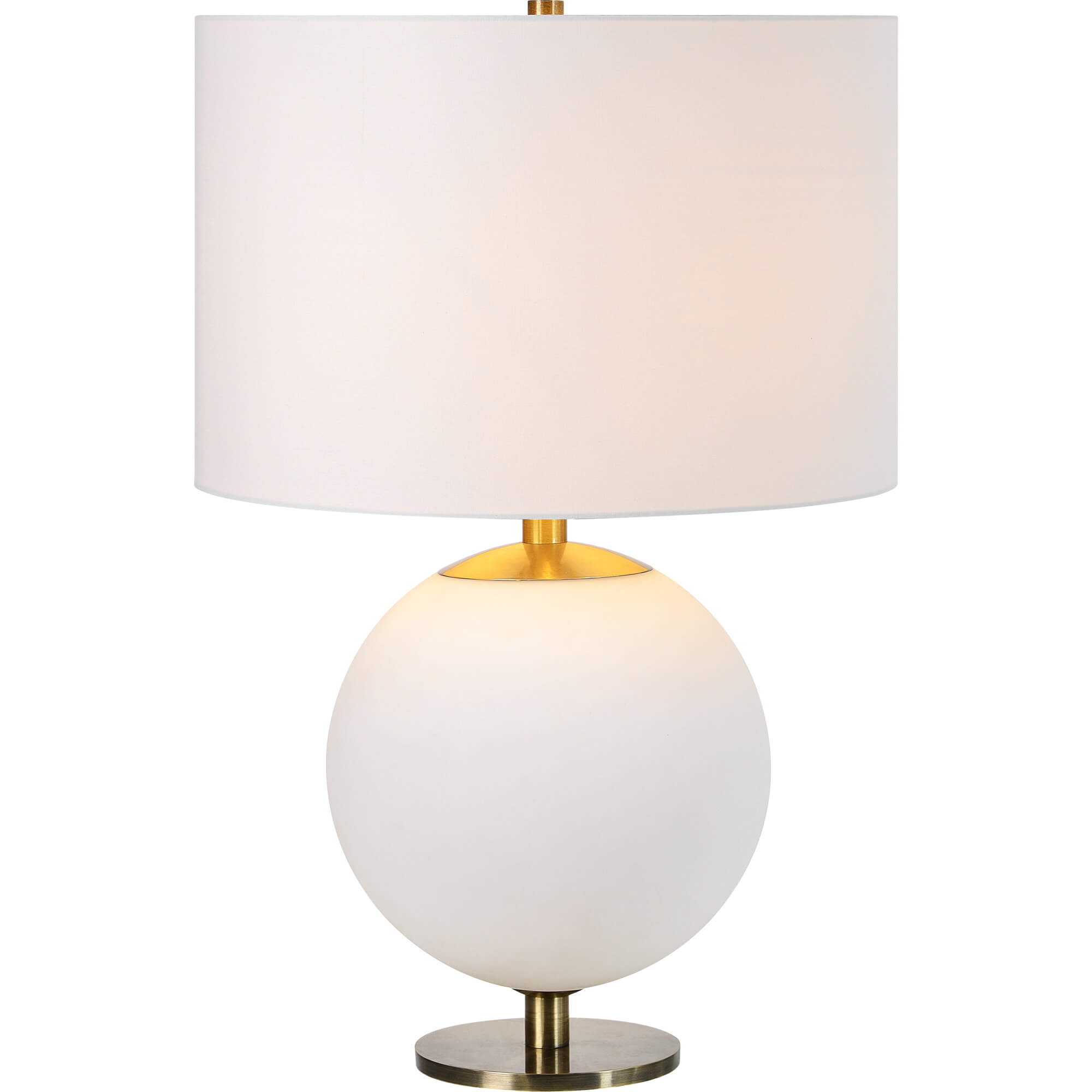 Architecture meets artistry in this lamp design. Whether placed in a bedroom or living room, it offers a welcoming quality to the space. The etched white iron base, antique brass details and off-white cotton shade form a fashionable trifecta, with each element complementing the other in shade and structure.