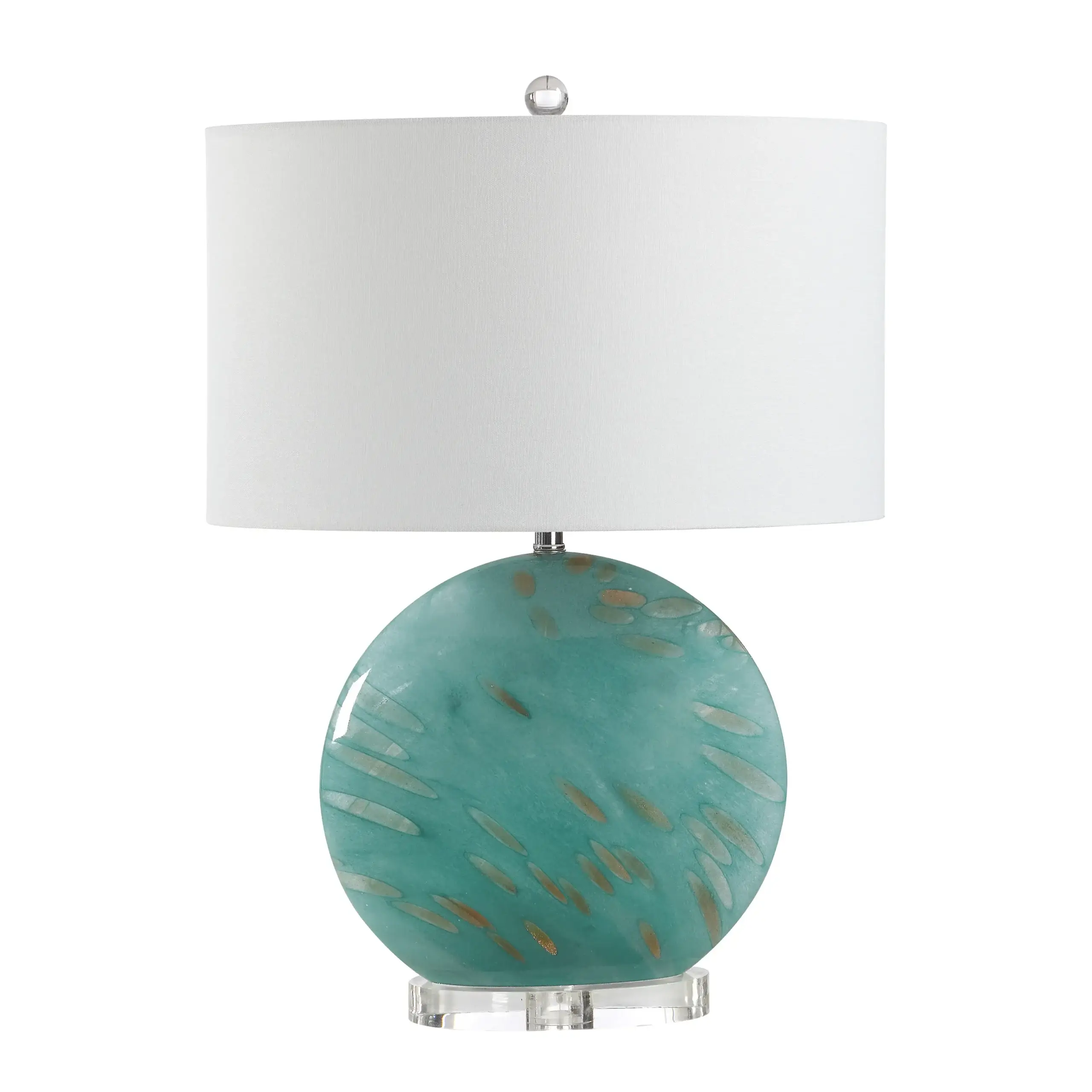 For a pop of colour in your decorating scheme, try this free-spirited table lamp. Crafted with crystal detailing on a green glass body, it bounces light throughout the room and imparts a playful vibe. An oval lamp shade provides a slimmed down silhouette that’s perfect for smaller spaces.