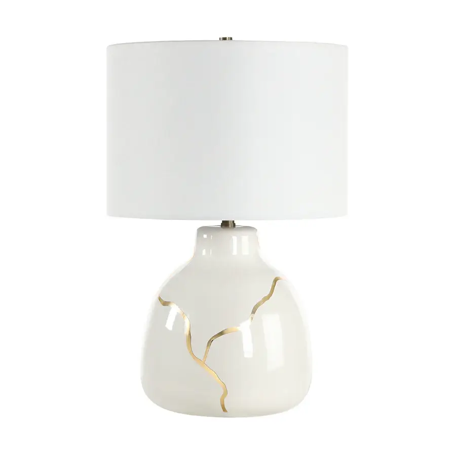 The Rhodes table lamp brings artful elegance to any space with its ivory ceramic base, embellished with graceful gold leafing inspired by Kintsugi craftsmanship. A clean off-white drum shade and dark antique brushed brass accents balance the design with modern flair. Warm and sophisticated, its gentle glow shines through its imperfect beauty.