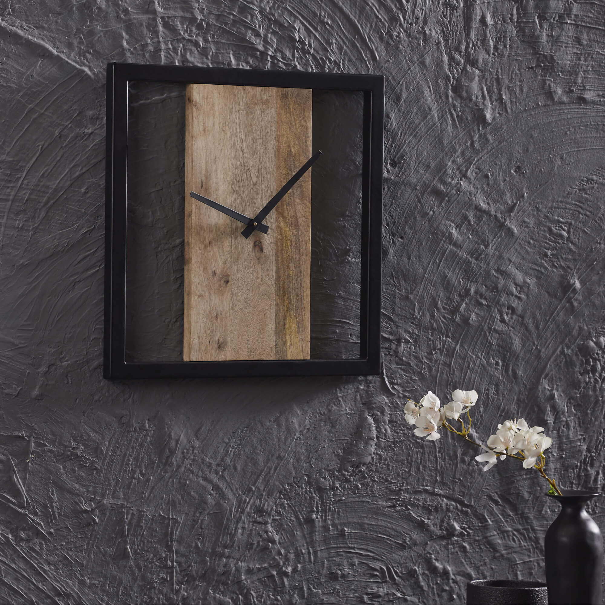 At once retro and contemporary, this wall clock injects the minimalist interior with style and personality. Showcasing a compilation of natural mango wood and matte black powder-coated iron, it ties together rustic inspiration and sleek simplicity in captivating fashion. With an 18-inch square structure, it serves a significant part of the décor within the living room or home office.