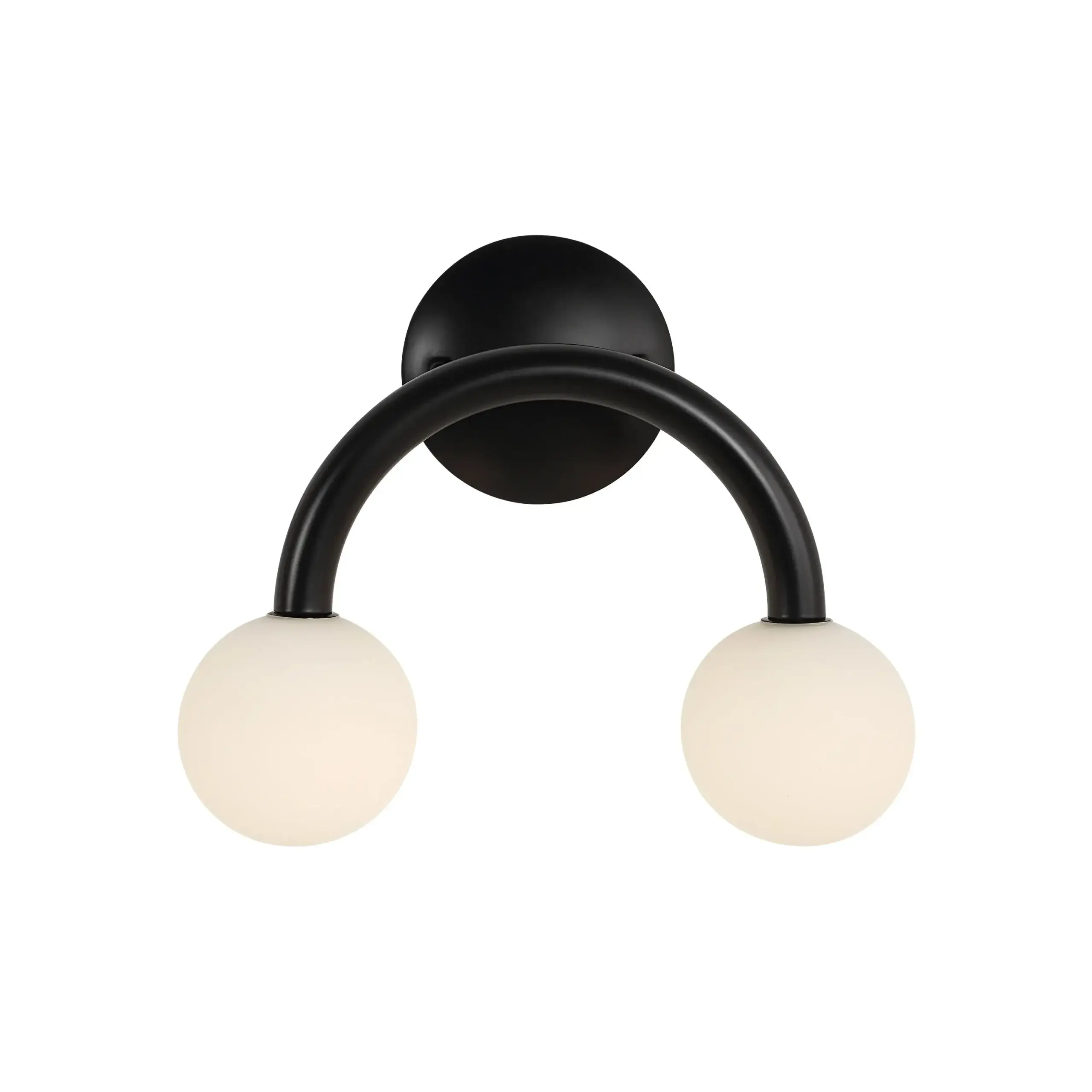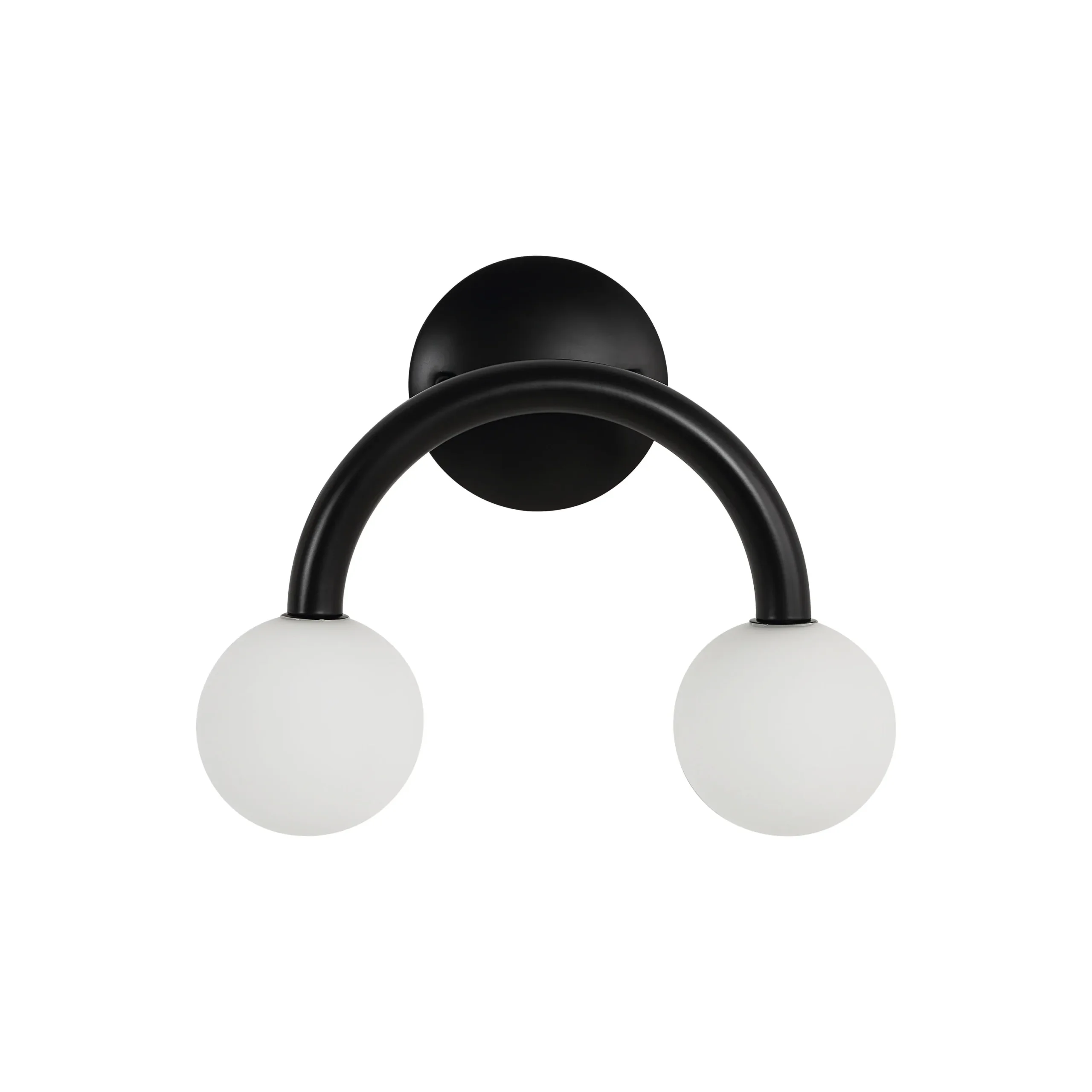 A stylish choice for contemporary interiors, this double-light wall sconce will bring a whimsical touch to your project. Its two white etched globes are suspended from a matte black-finished iron fixture, delivering an airy aesthetic and modern vibe anywhere you feature it. Perfect for pairing up or showcasing solo.