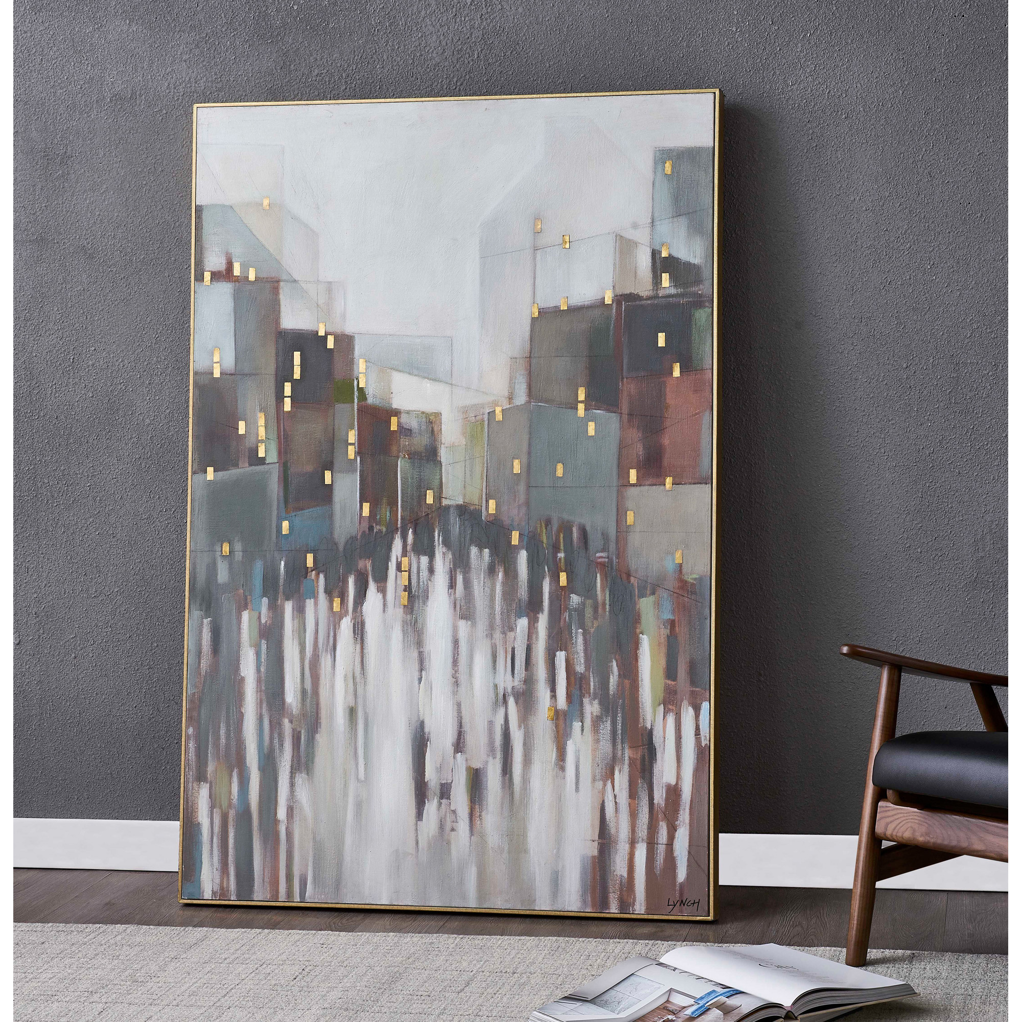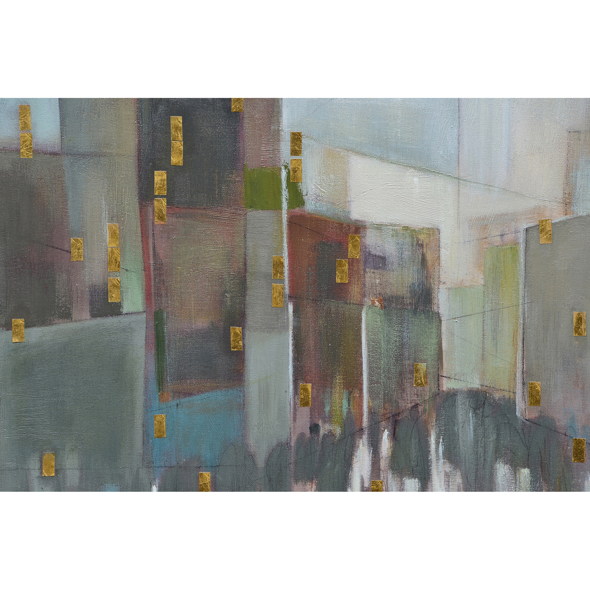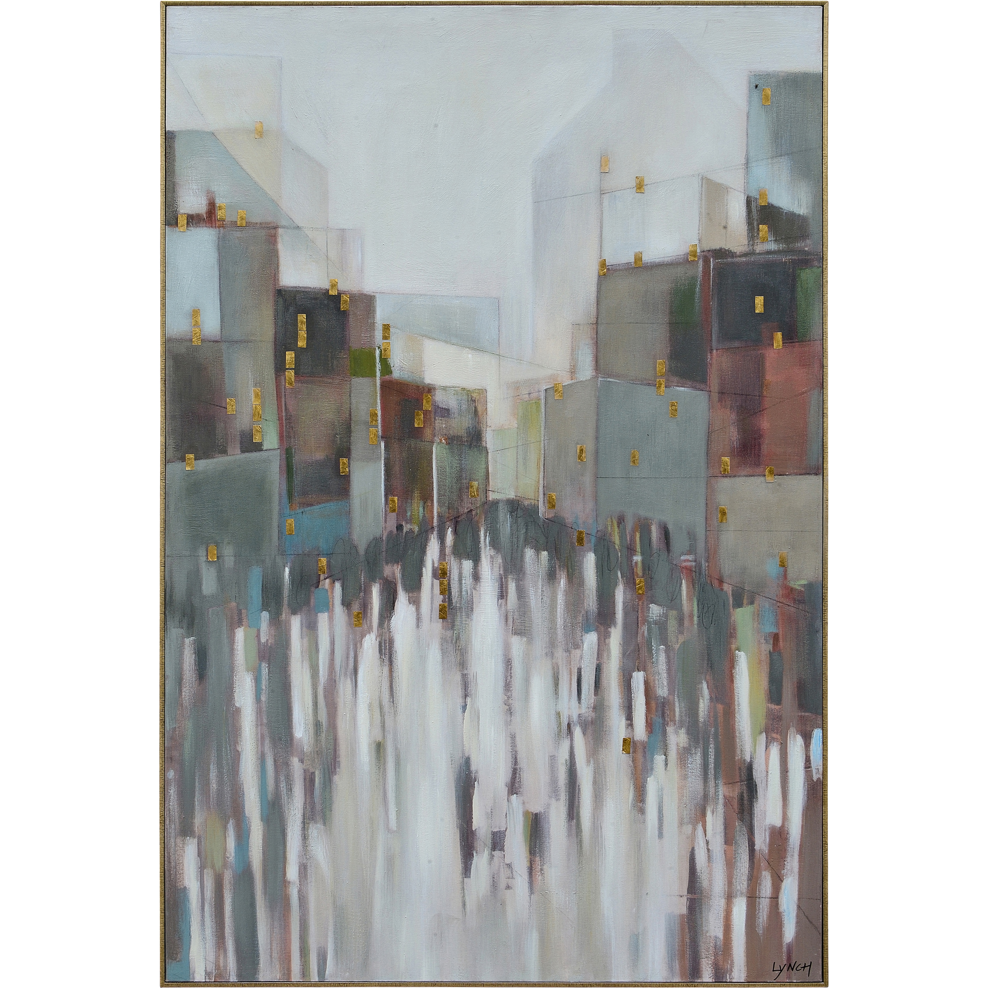 While evocative of a bustling city street, this painting has a zen quality that permeates the contemporary interior. Featuring a neutral-toned colour palette, it integrates seamlessly into the room while the touches of gold leaf add a vibrant energy. Created on a cotton canvas, it is equally fitting for placement in the bedroom or living room space. Artist: Charlene Lynch