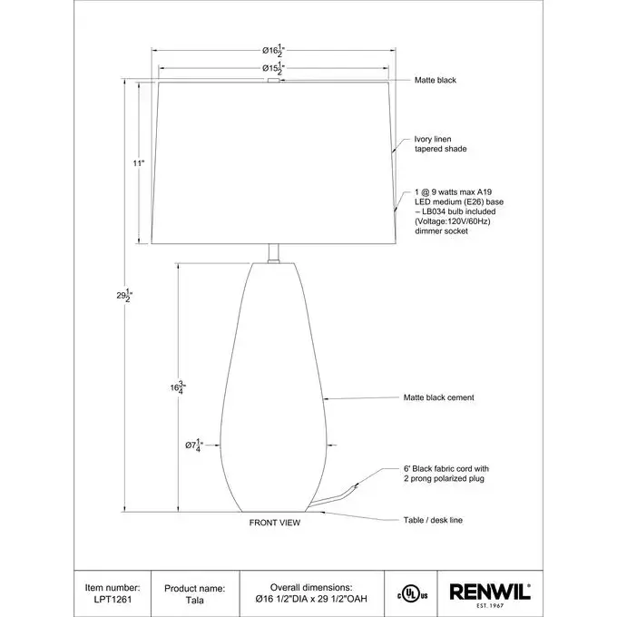 Upgrade the look of your space with the Tala 30 tall table lamp. With a sleek matte black finish and a tapered cream linen shade, this lamp is the perfect accessory for any room. The sturdy black fabric cord ensures lasting performance and creates a clean, minimalistic look. Equipped with a dimmer socket, you can customize the lighting to your liking. The lamp seamlessly connects with standard E26 sockets, and is compatible with bulbs up to 100W to support a wide range of lighting options. Its dimmer socket also allows you to customize the lighting to suit your mood and preference.