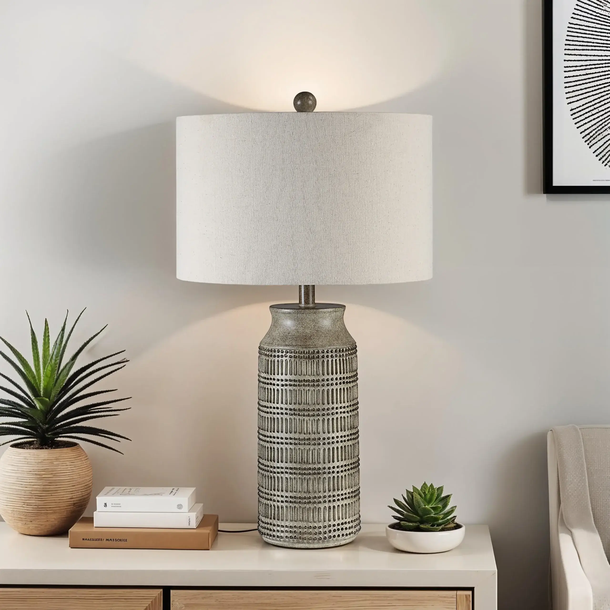Check all the boxes on your neutral decorating scheme’s must-have list with the Tarragona table lamp. Featuring loads of texture, its patterned body joins forces with a cream linen drum shade to create a tonal masterpiece worthy of any modern or traditional setting. Place one or a pair in the room of your choice for an instant update.