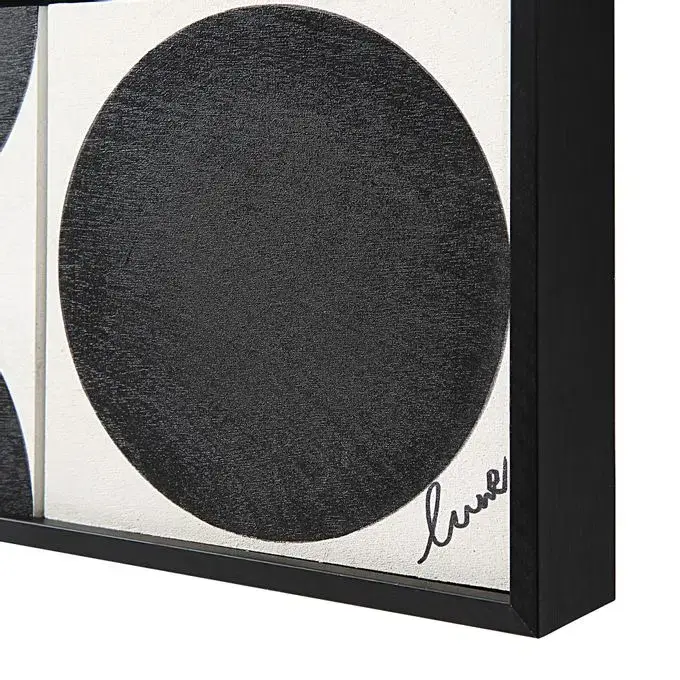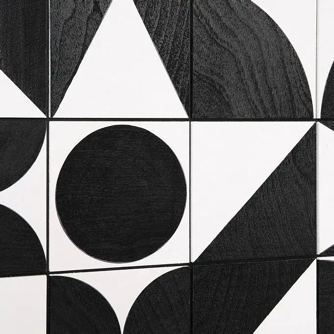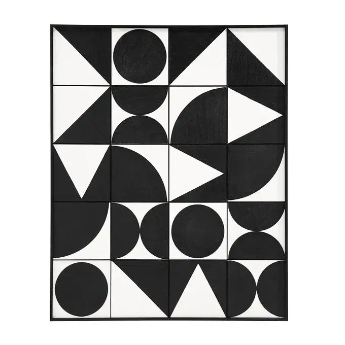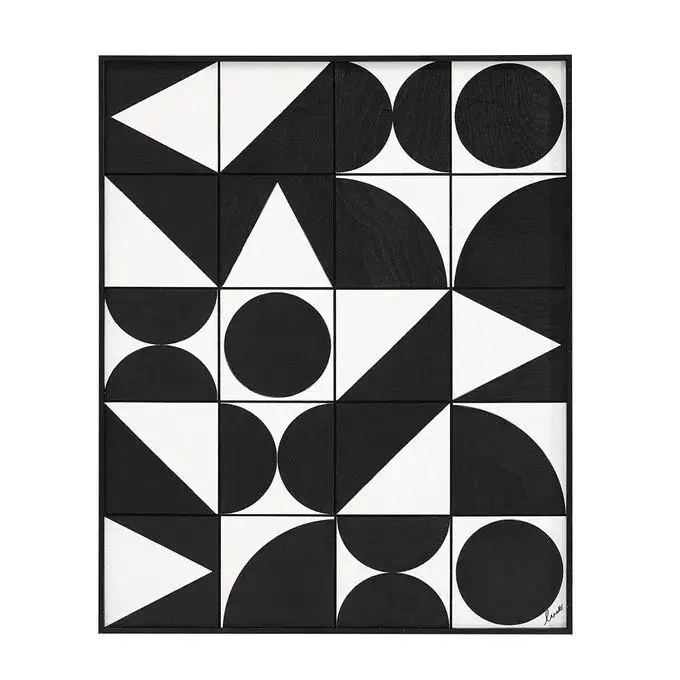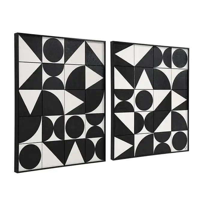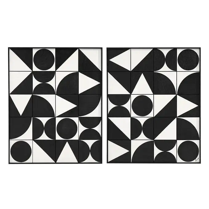 Hand painted tiles come together to create this set if two works of wall art that showcase new facets of themselves at every passing. These framed works of art are best styled with minimal decor elements that allow their intricate shapes to take the spotlight. Capable of hanging horizontally and vertically, each compositions creates a new story with each arrangement.