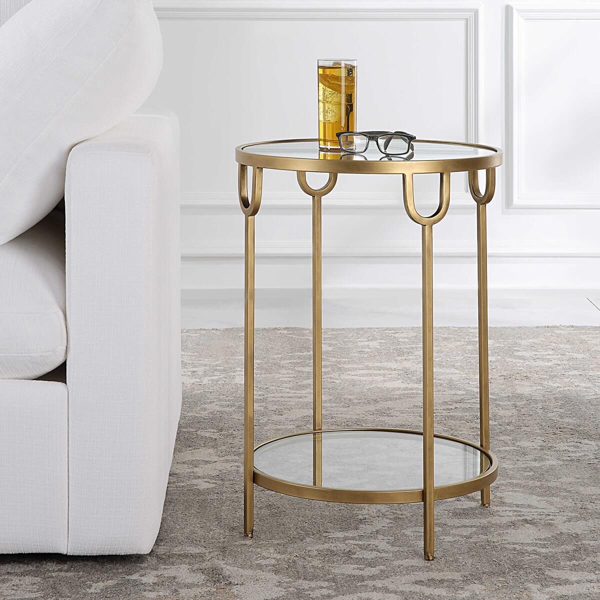 This round, two-tiered side table made of iron, features a mirrored top and tempered glass on bottom. Finished in an antique gold, this table will be perfect with almost any decor.