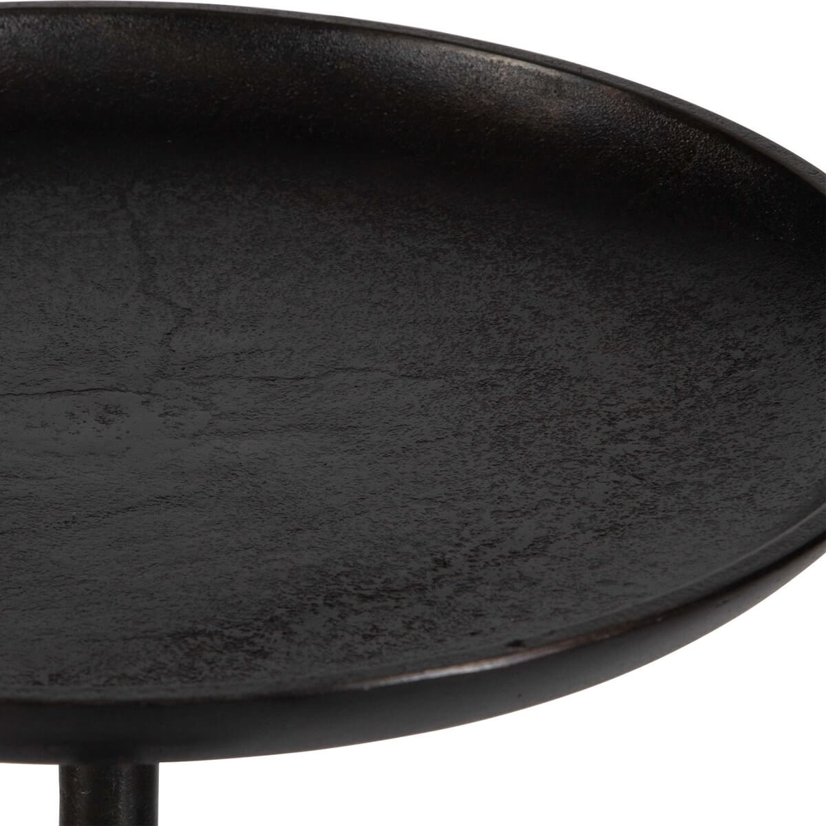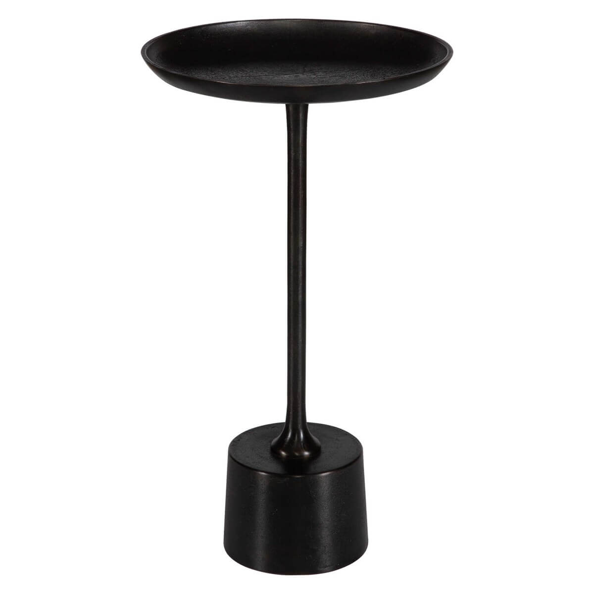 This round aluminum accent table, finished in a dark brown oxidized finish, features gentle curves that complement the overall soft features. The smooth texture within the finish adds to the appeal of this table. The slightly tapered base provides stability and enhances the curvature of the table's beautiful tray. This accent table will be perfect for that special place.