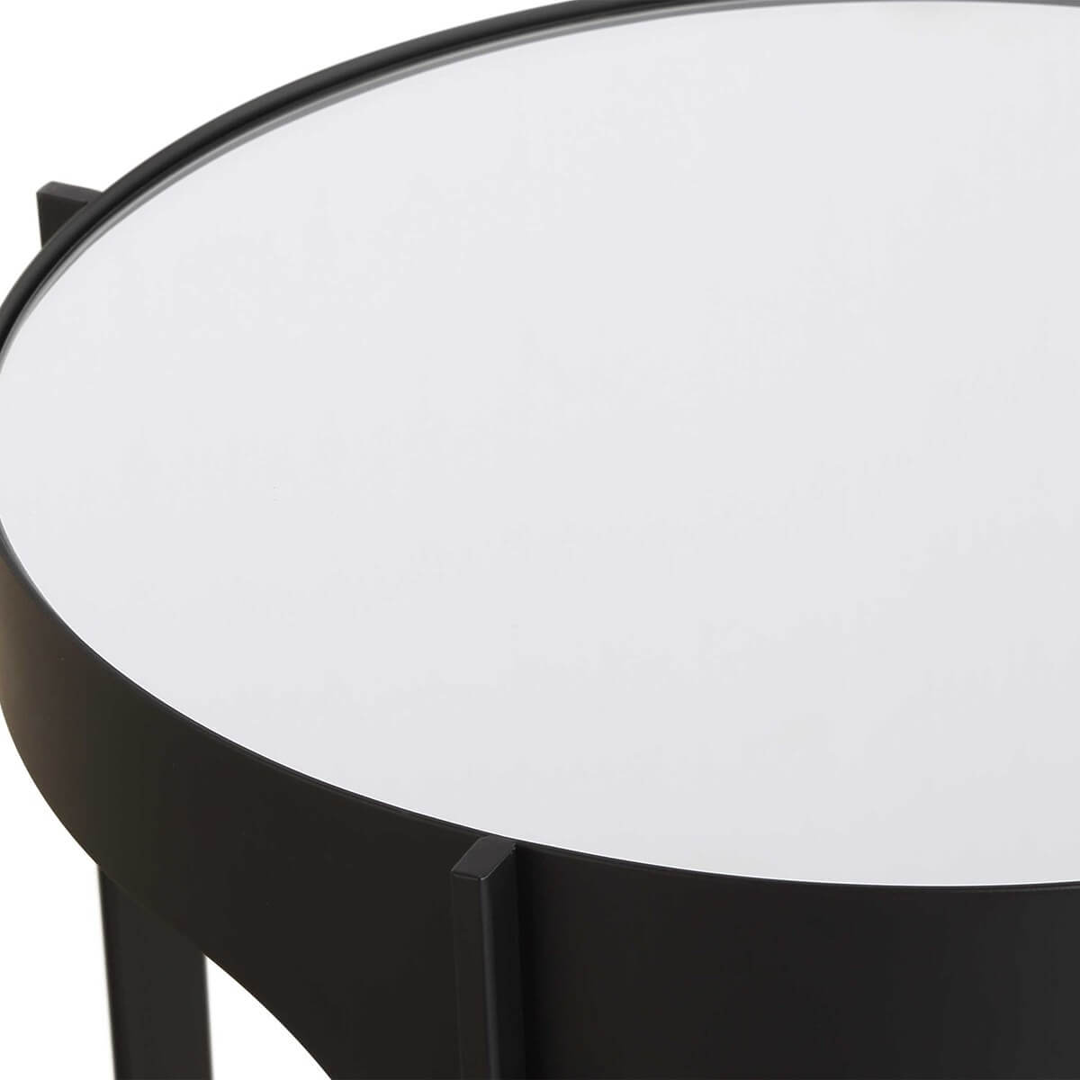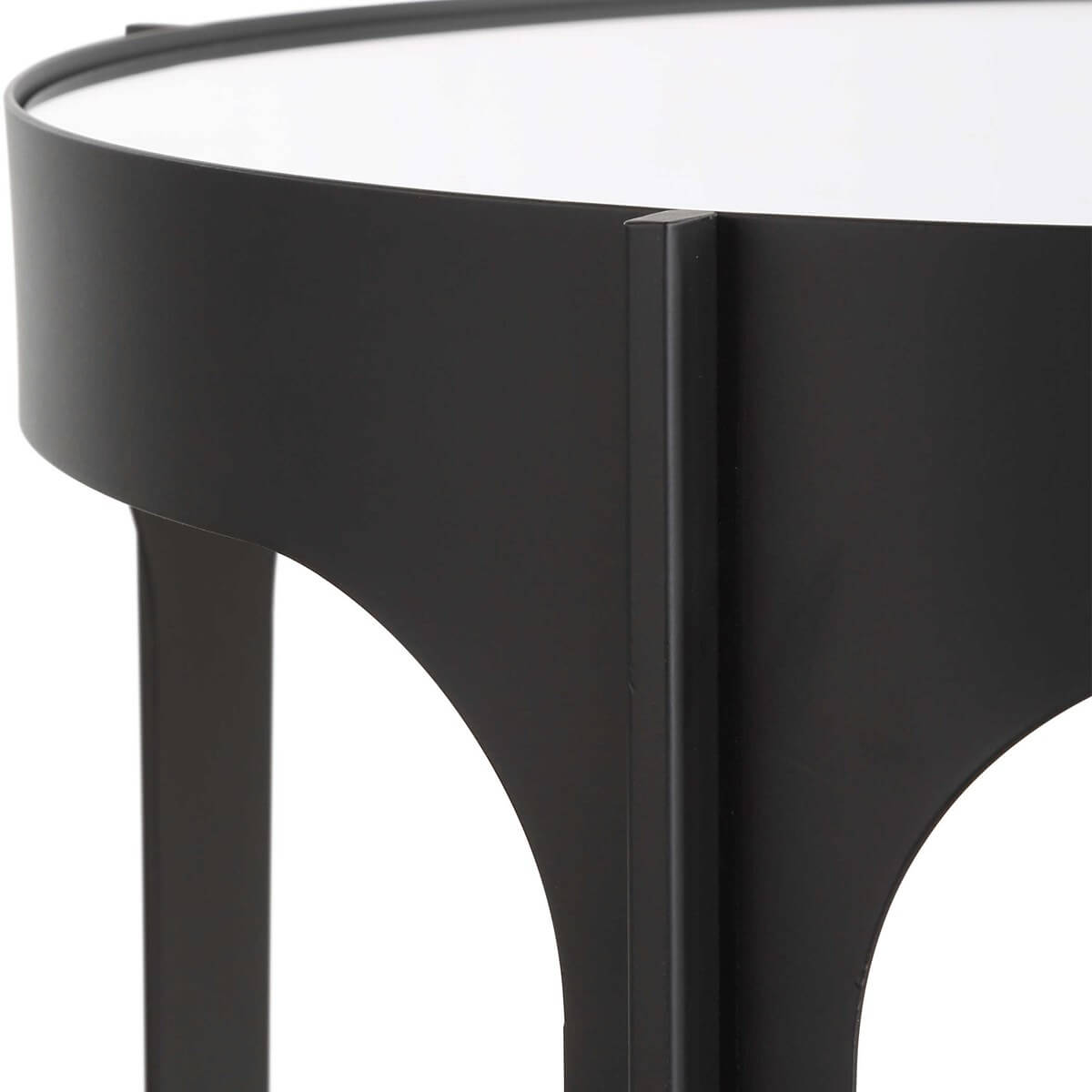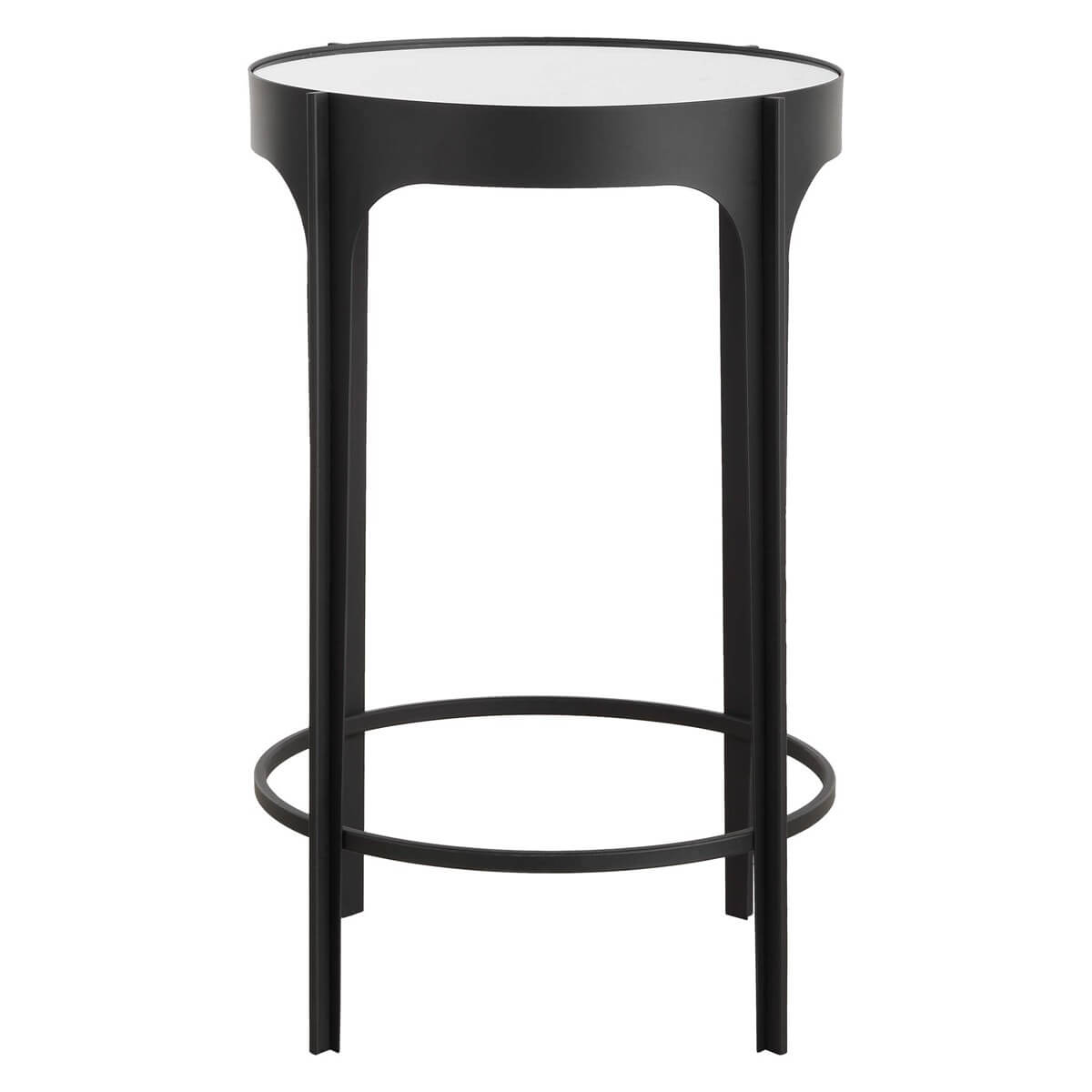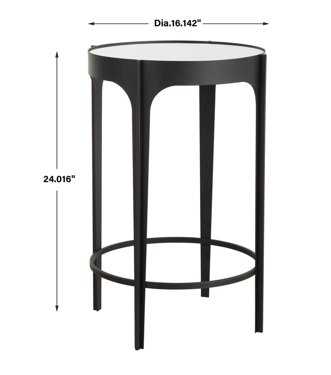 This stylish and functional iron accent table is finished in a matte black and features a mirrored top. Each leg is adorned with a thin vertical piece of metal, bringing attention away from the table's soft curves.