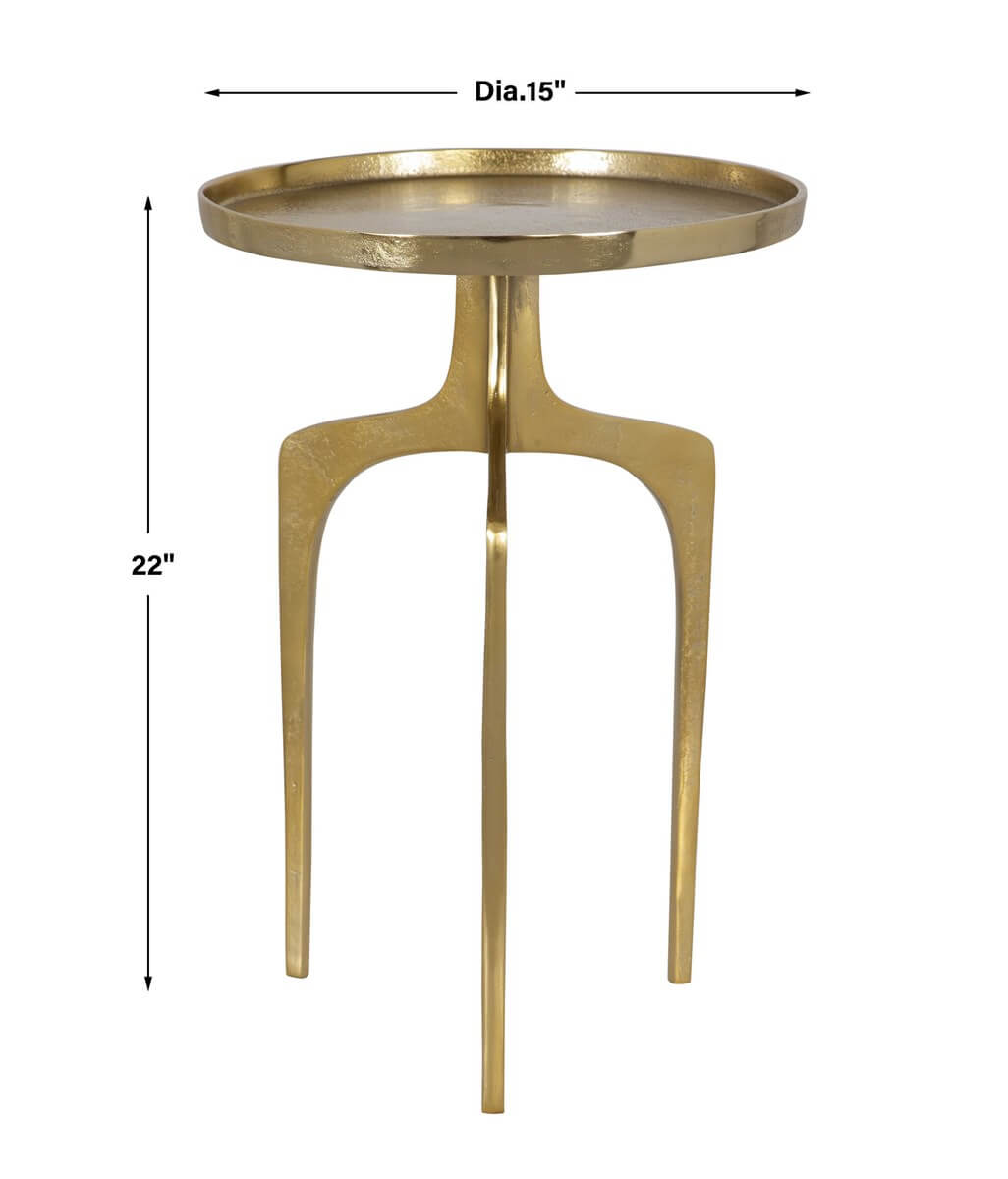 The unique design of this accent table features three curved legs and a solid round top, which is accented with a .75" raised lip. This cast aluminum table is finished in a slightly textured soft gold. Perfect beside your favorite chair!