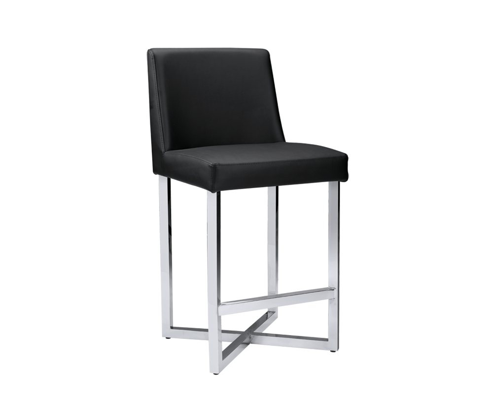 This contemporary stool features a sturdy stainless steel x-base and footrest. Stocked in grey, white and black faux leather with fire rated CA foam. A versatile and attractive stool for various settings.