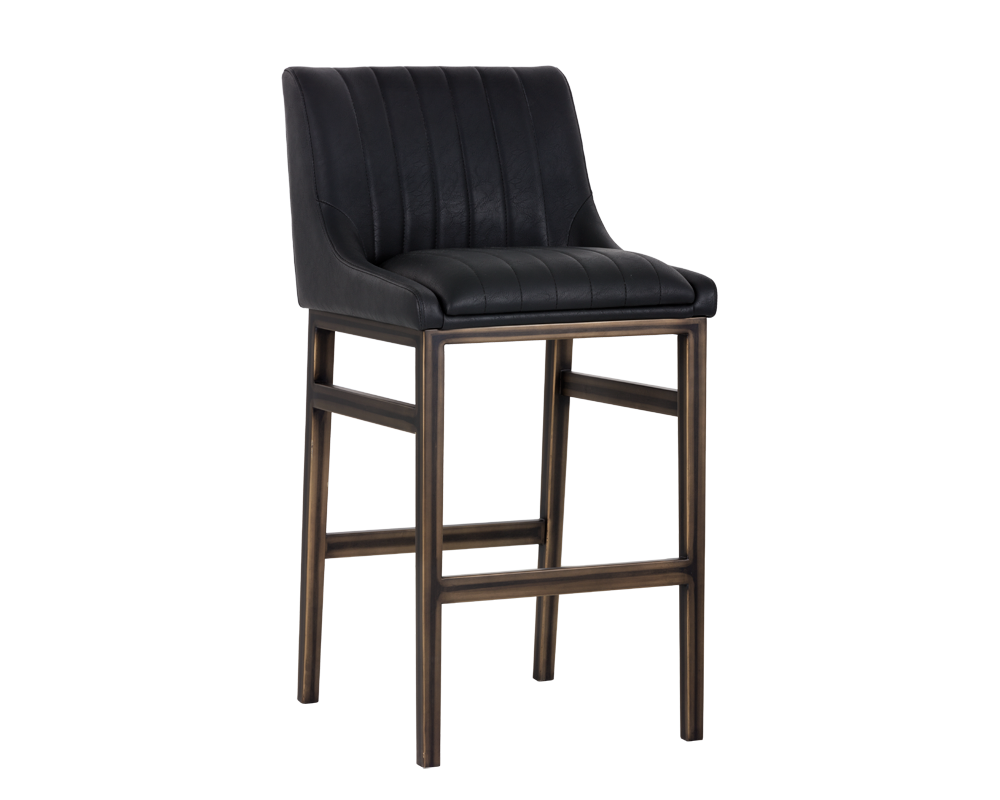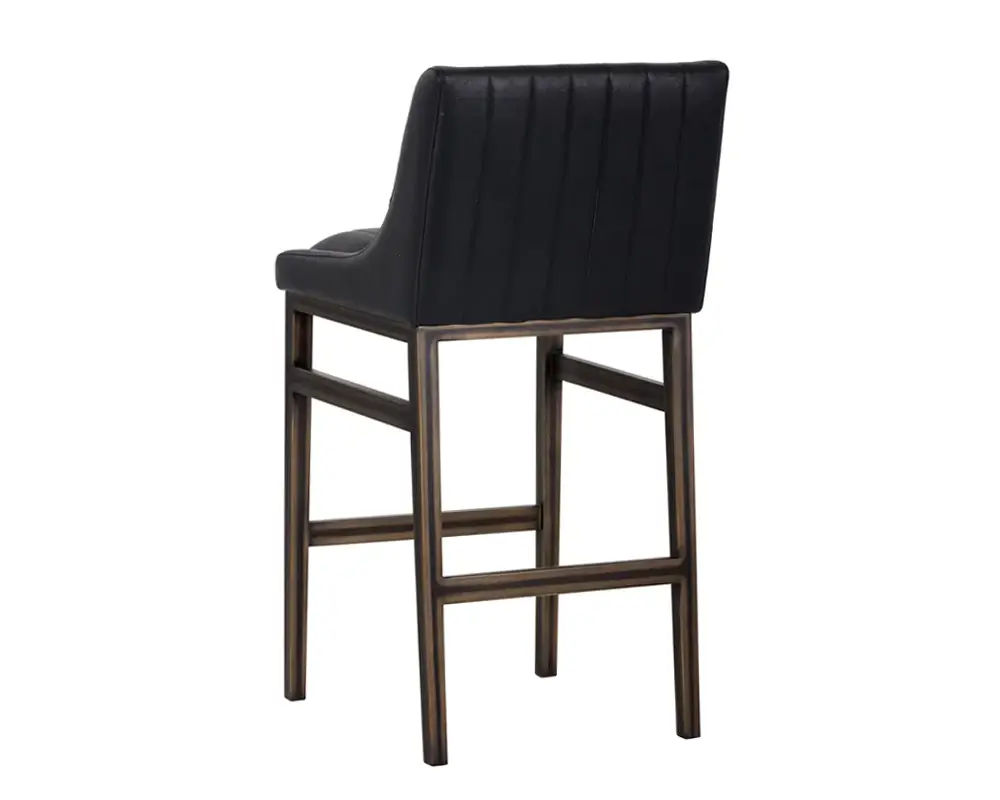 An urban designed stool featuring bold vertical channel tufting on the seat and back in vintage black, cognac and blue faux leather. Finished with a rustic bronze steel frame and stretchers. Great for residential and commercial placements.