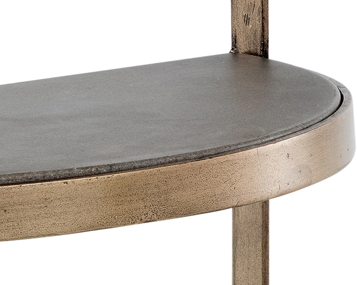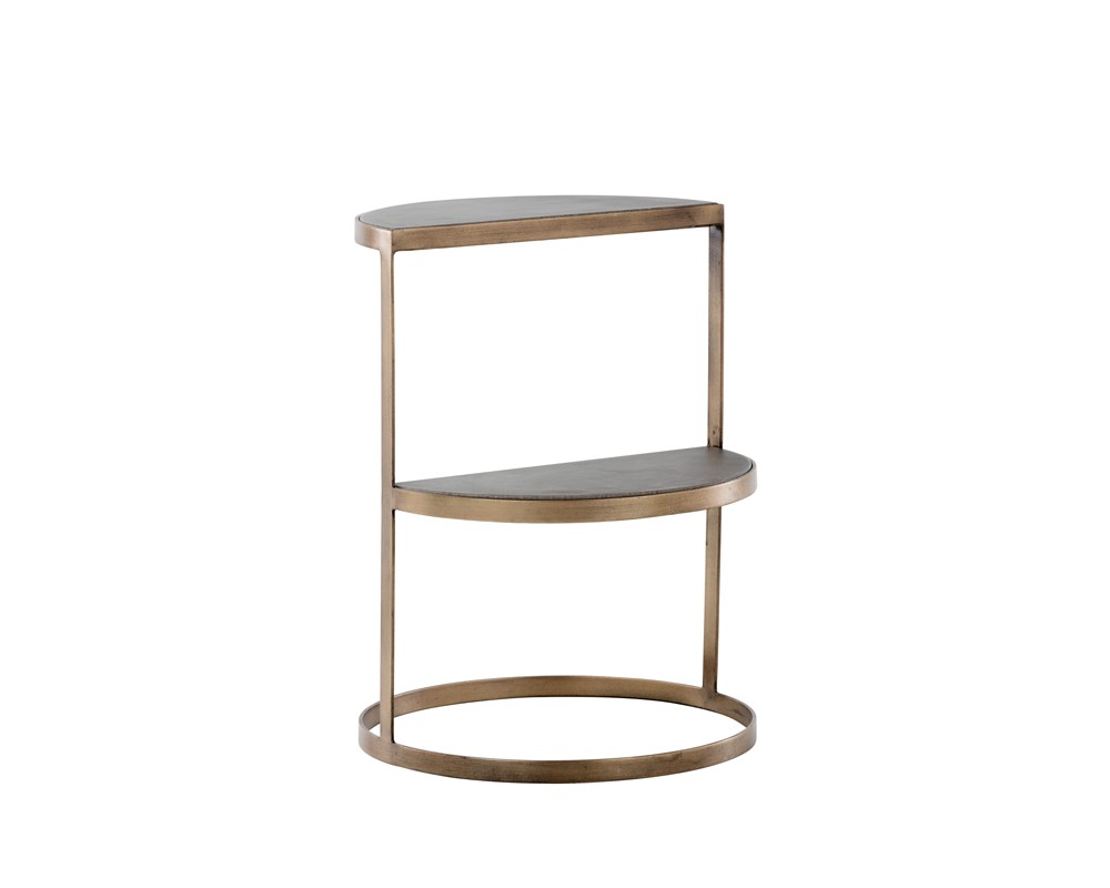 This interesting end table from our MIXT collection is inspired by the changes in shape and movement of the moon. The semi-circle tops are constructed of concrete and tiered for added dimension. Supported by a beautifully structured antique brass metal frame.