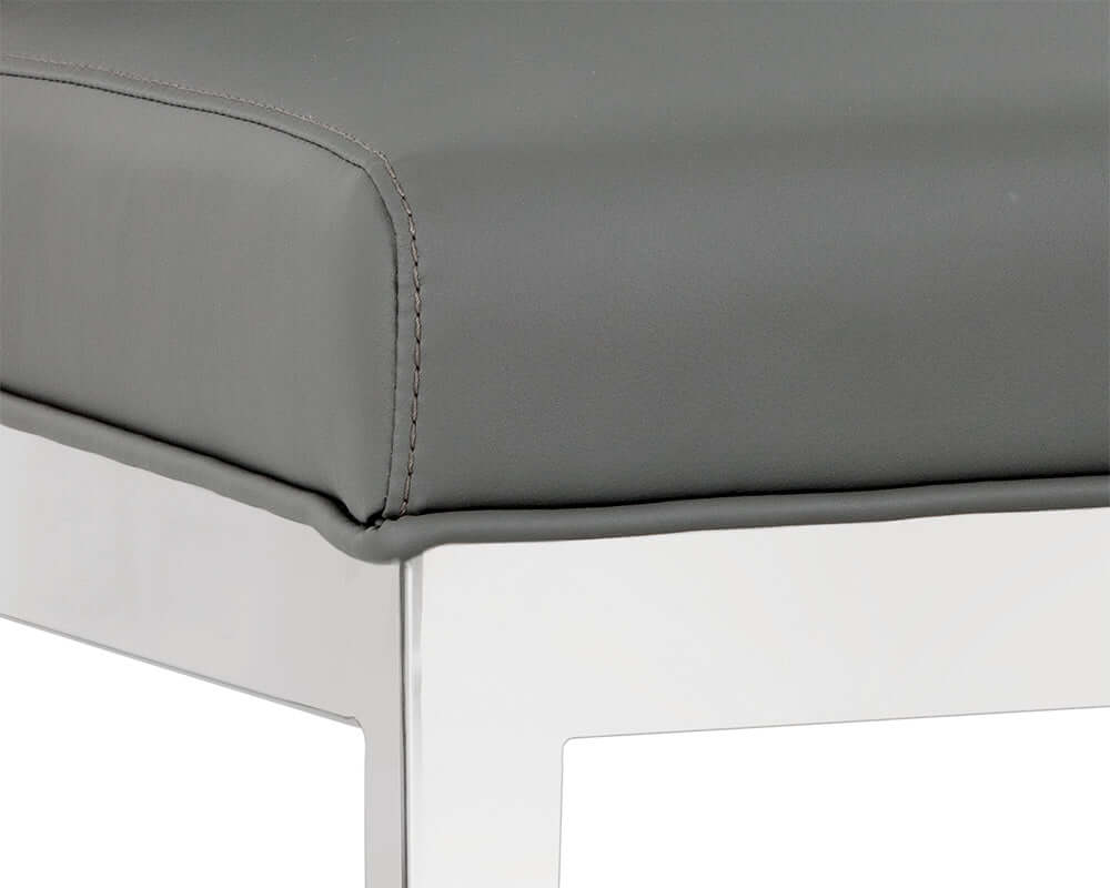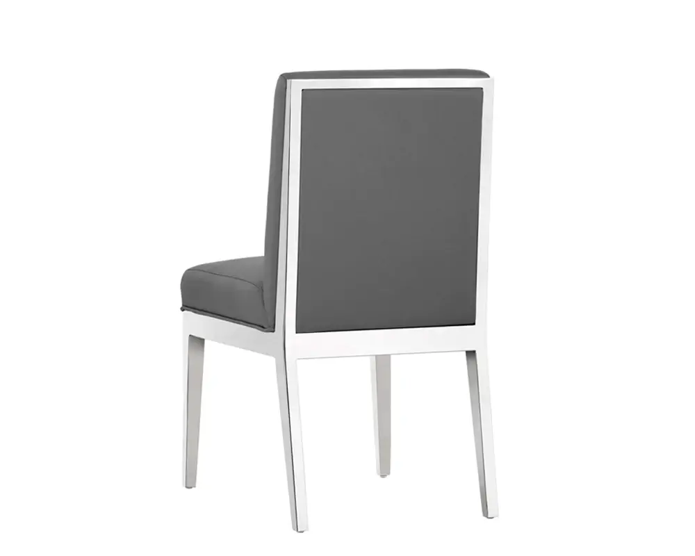 A simple yet stylish dining chair from our Ikon collection. Featuring a black, grey and white faux leather seat with a sleek and sturdy polished stainless steel frame and legs. Can be used in both transitional and modern dining spaces.