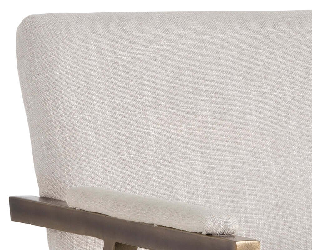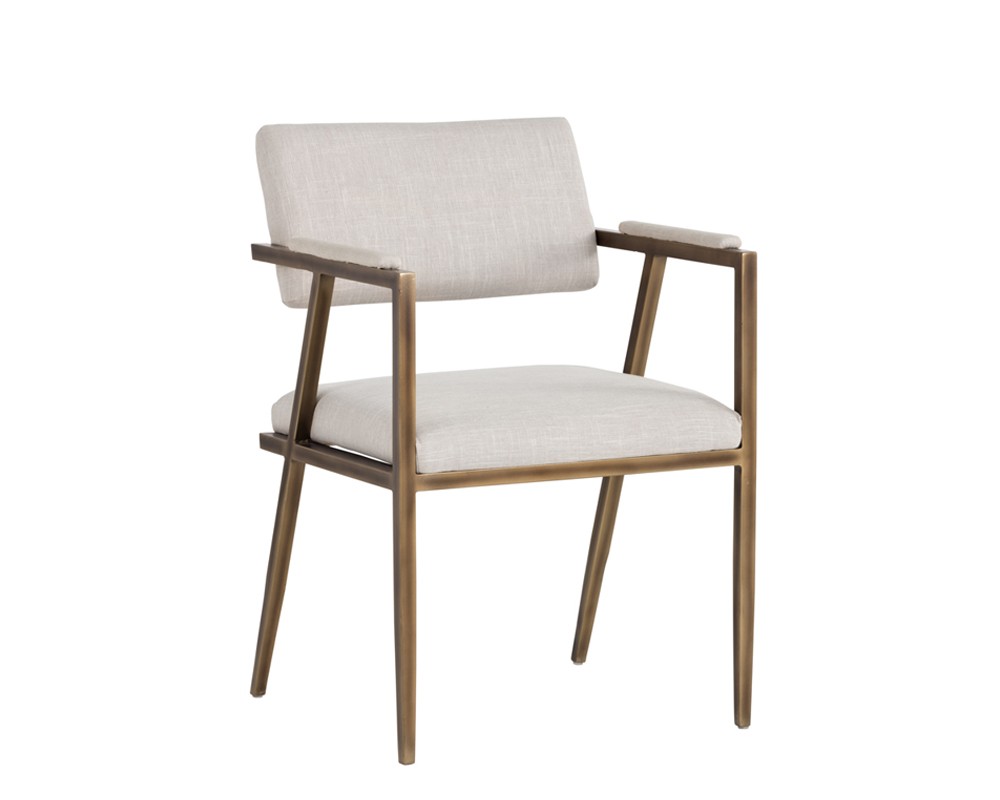 Industrial meets transitional elegance in this armchair from our Irongate collection. Reminiscent of mid-century modern styling with a rustic bronze steel frame and beige linen or vintage black faux leather on the seat and seat back. Can be used in both dining and living spaces.