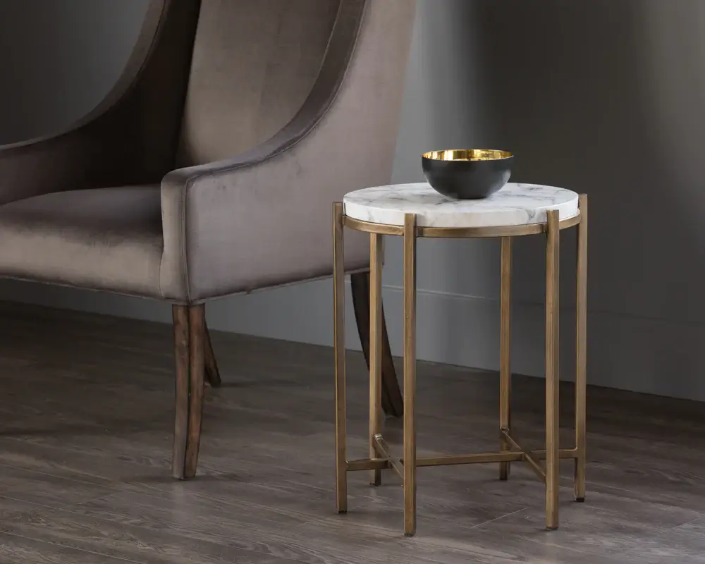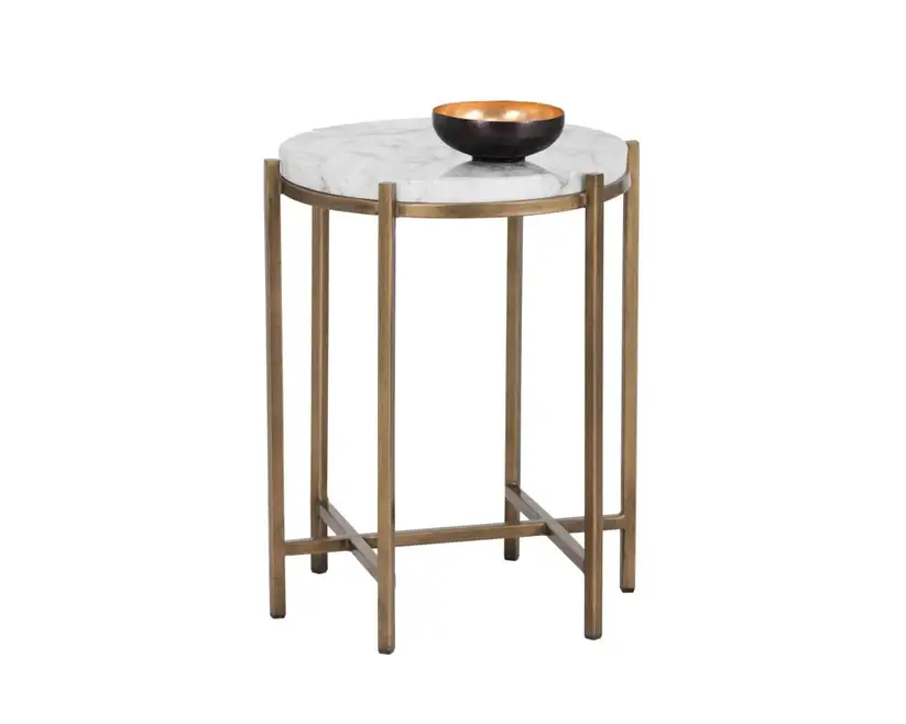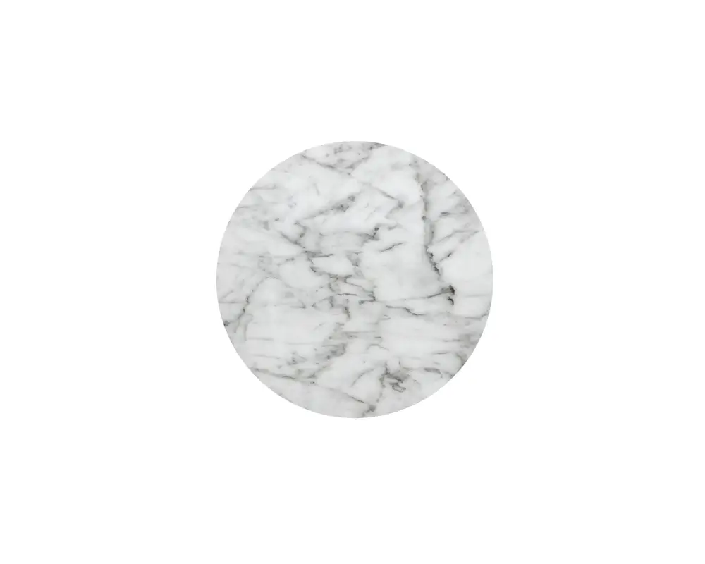 This round end table from our MIXT collection combines natural and industrial elements for a dramatic look. Features a white marble look film top supported by an architecturally designed brushed antique brass steel base. Suitable for residential and contract environments.
