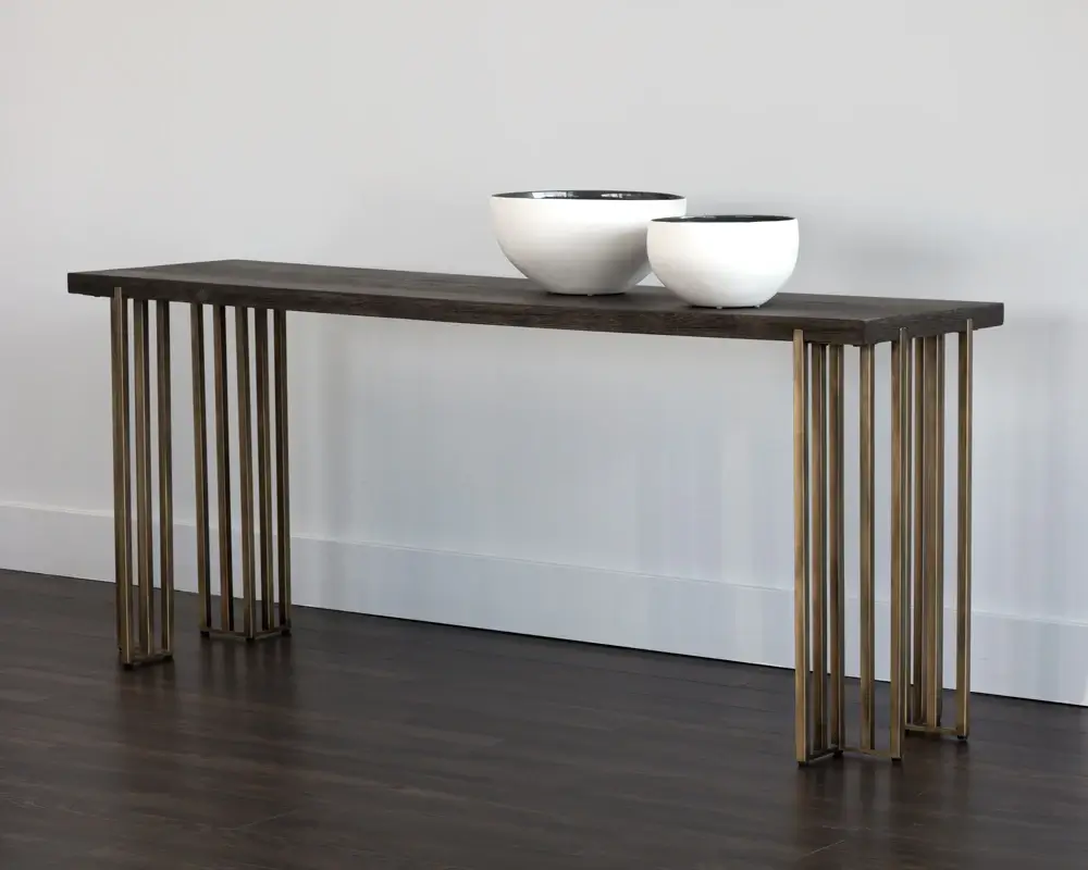 This console table from our MIXT collection will bring warmth and style to various living and lounge spaces. The oak wood veneer top is complemented with architectural antique brass steel legs for added appeal. Suitable for residential and contract environments.