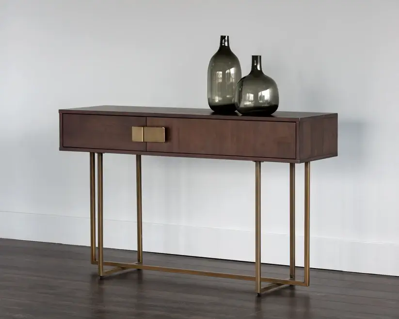 This uniquely crafted console table from our MIXT collection will add transitional allure to any foyer, living or dining space. Made from acacia wood veneer with two soft closing drawers. Alternating wood grain patterns on the drawer fronts and antique brass hardware complete the look. Suitable for residential and contract settings.