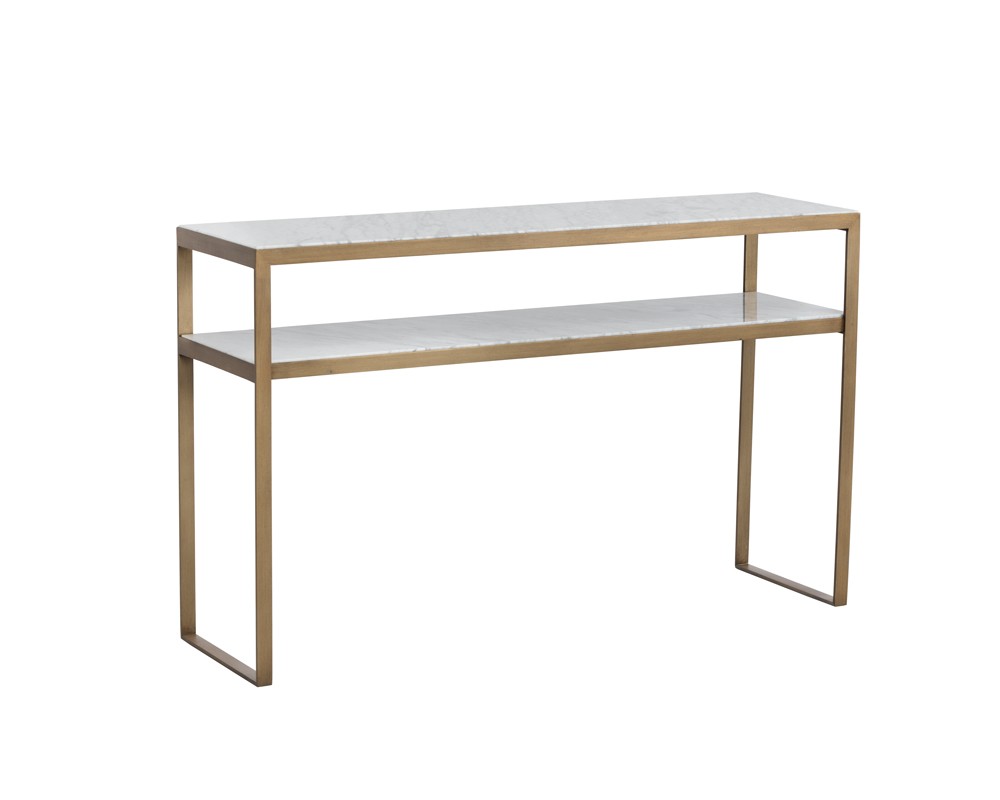 A beautiful console table from our Directions collection. Tabletop features a 1" layer of white Italian marble supported by an antique brass steel frame.