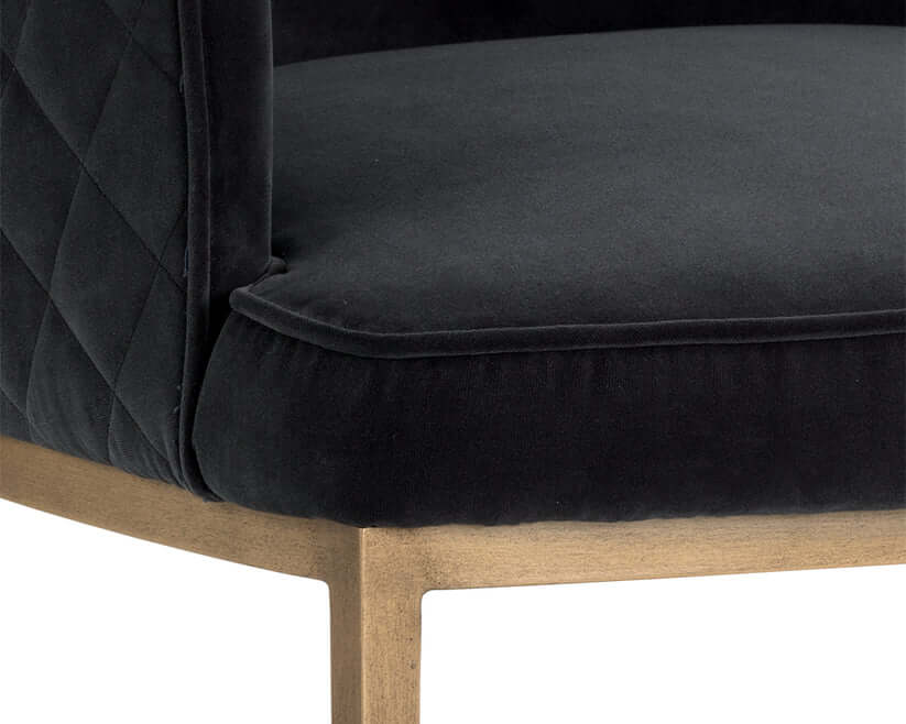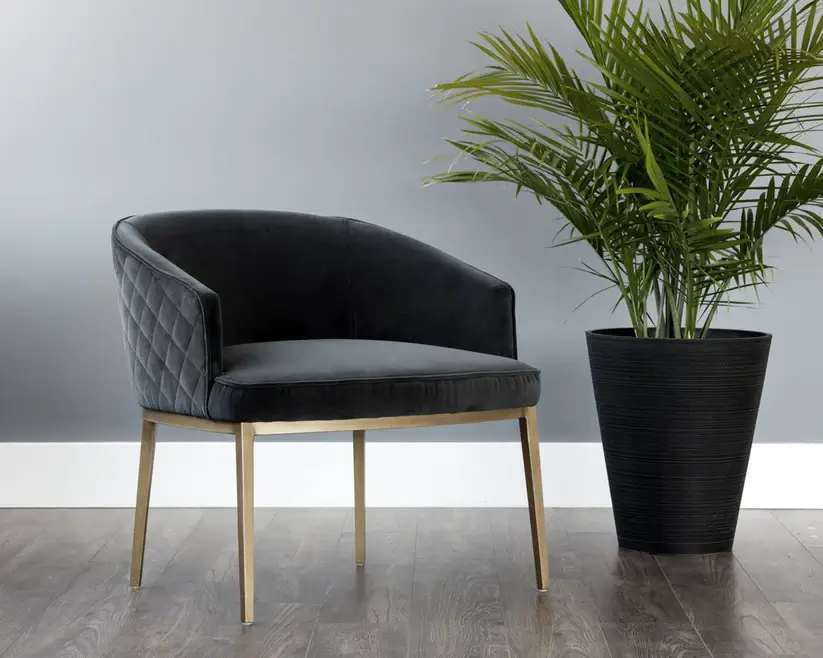 Feminine flair comes to life in this lounge chair from our Directions collection. Stocked in our soft blush pink and shadow grey fabric with elegant diamond stitching on the exterior seatback. An antique brass steel frame completes the look.