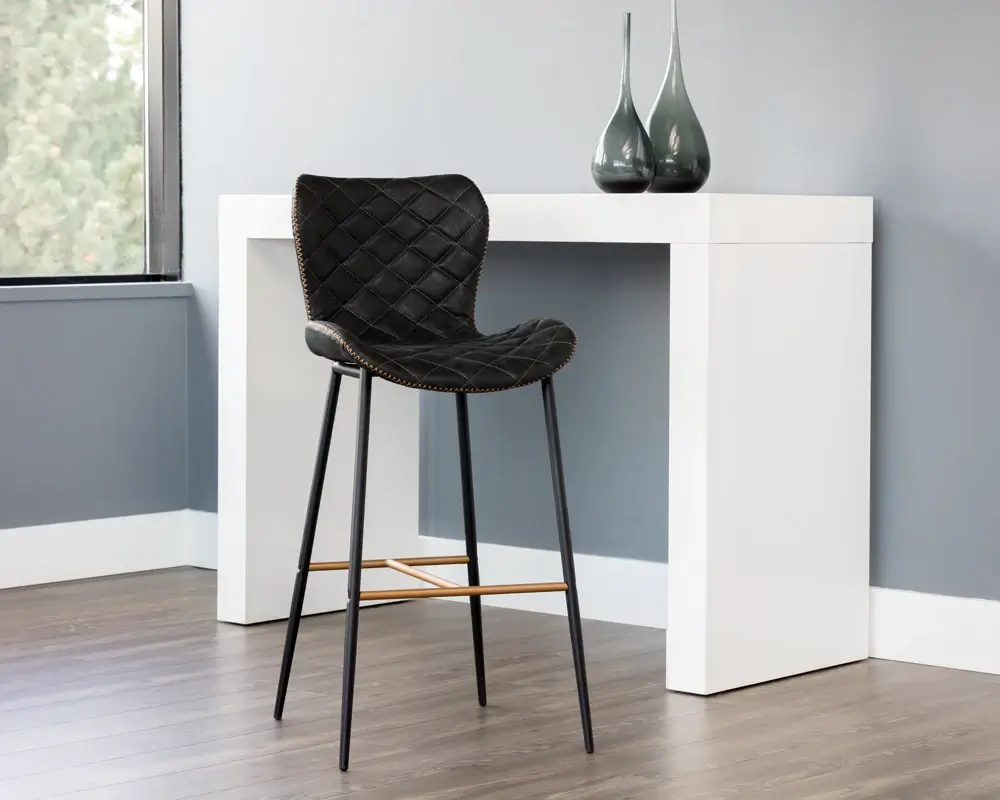 A stylish barstool from our Urban Unity collection. Features a sculpted diamond-stitched seat and exposed zig-zag stitching along the seat frame. Stocked in antique black and brown faux leather with black steel legs. Stretchers in an antique gold finish complete the look.