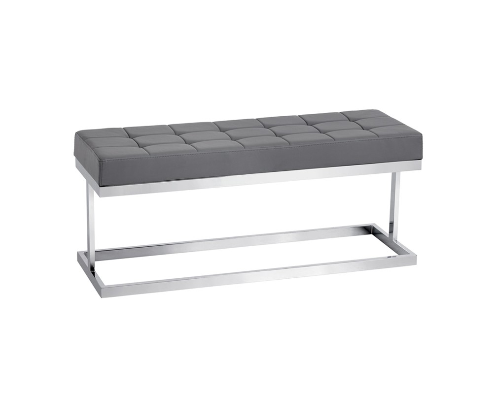 This stunning bench is made of polished steel, and features fire rated faux leather and foam. Ideal for residential or commercial environments.