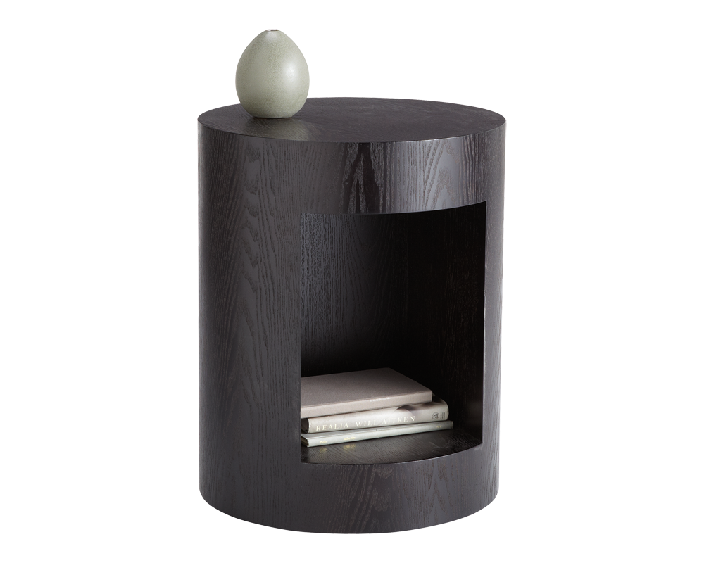 This contemporary table features a large open space for storage ordisplay. Use between two occasional chairs or beside a bed as a stylish nightstand. Stocked in a rich espresso finish. Also available in high gloss white. Opening measures, 11in x 13.5in x 14in (LxDxH)