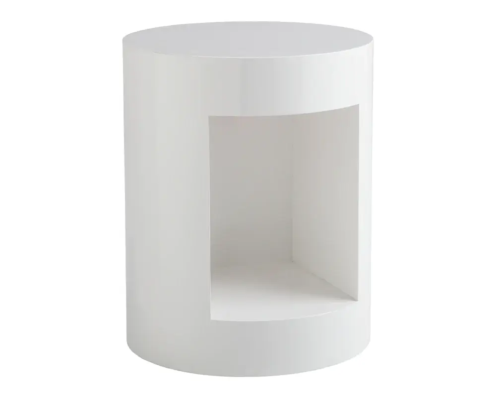 This contemporary end table features a large cut out space for storage and display. The perfect mix of good design and function. Made of oak veneer finished in high gloss white. Also available in espresso. Opening measures, 11in x 13.5in x 14in (LxDxH)