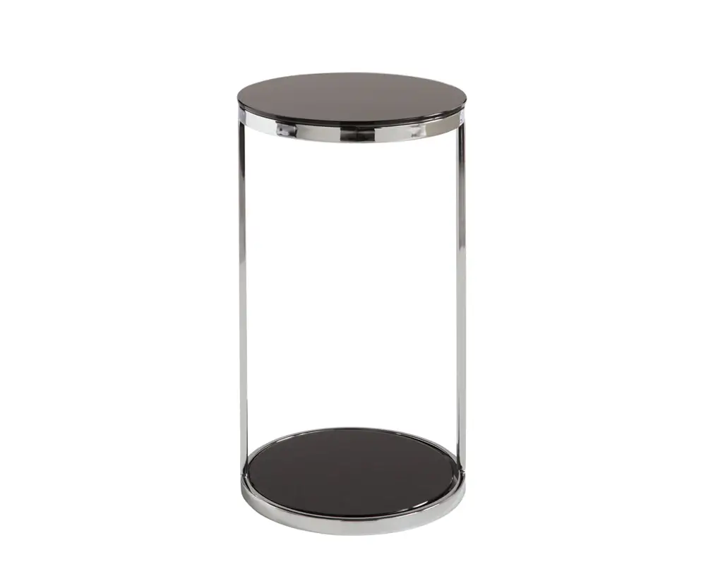 This end table features tempered black glass on a polished steel base.Perfect for compact spaces in both transitional and modern environments.