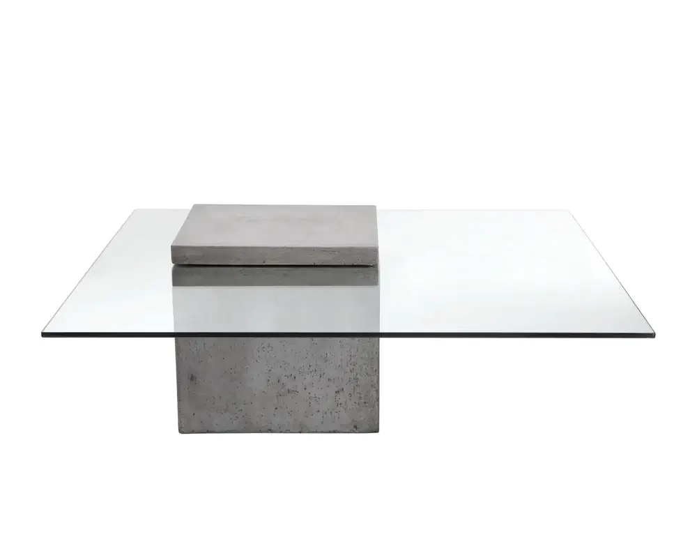 A bold concrete block defines this industrial modern coffee table. Features a contrasting 10mm tempered glass top embedded within the top of the base. A perfect complement to the design. Crafted from a natural concrete mix, each piece will look different