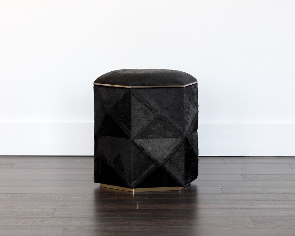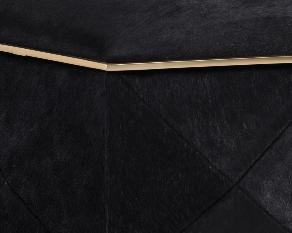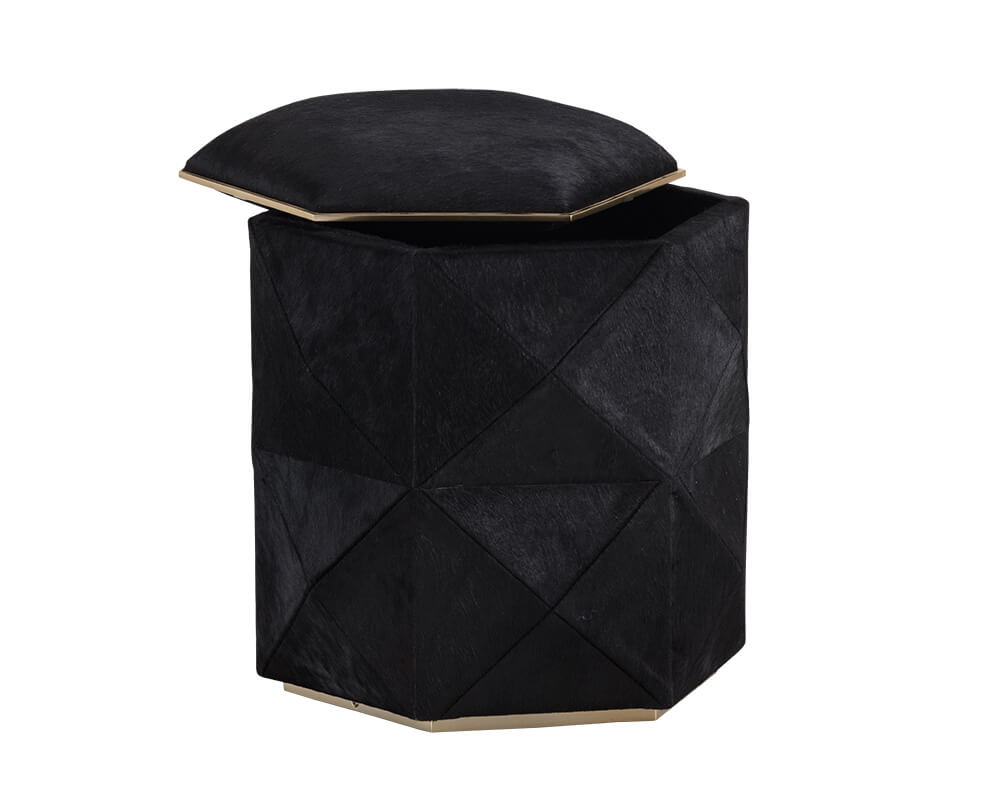 This glamorous ottoman from offers elegance and allure. Features a beautiful geometric design with added storage. Stocked in black cowhide with a polished gold steel frame or grey cowhide with a polished silver frame. As cowhide is a natural material, organic markings on the animal may still be visible and there may be apparent differences in hair length, colour, and pattern. No two pieces are alike and images on site may not capture these qualities precisely. Made in India. With refined craftsmanship, this design was brought to life by skilled local artisans. By nature, these materials develop unique imperfections such as fissures, markings and colour variations for a truly one-of-a-kind piece.