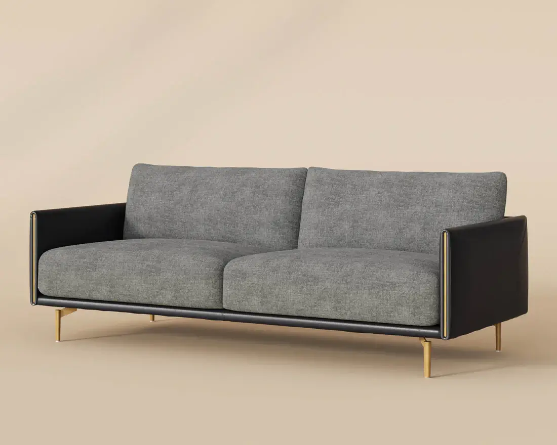 Mixed materials and contrasting colours give the Ashi Sofa an elevated design. Soft cushioning upholstered in nash zebra fabric provides ample comfort. Stitched detailing on the side of the arms gives a subtle geometric design that enhances the coal black faux leather frame. Satin brass aluminum on the legs and trim on the front of the arms ties the look together. Handle With Care: This design has been crafted with faux leather. Faux leather is manufactured to reflect the natural characteristics of leather; as such, colour variations, markings, wrinkles, grooves, and light scratches are appreciated characteristics. No two pieces will be alike. Visit our Product Care page for more information on how to ensure the lasting beauty of this piece.
