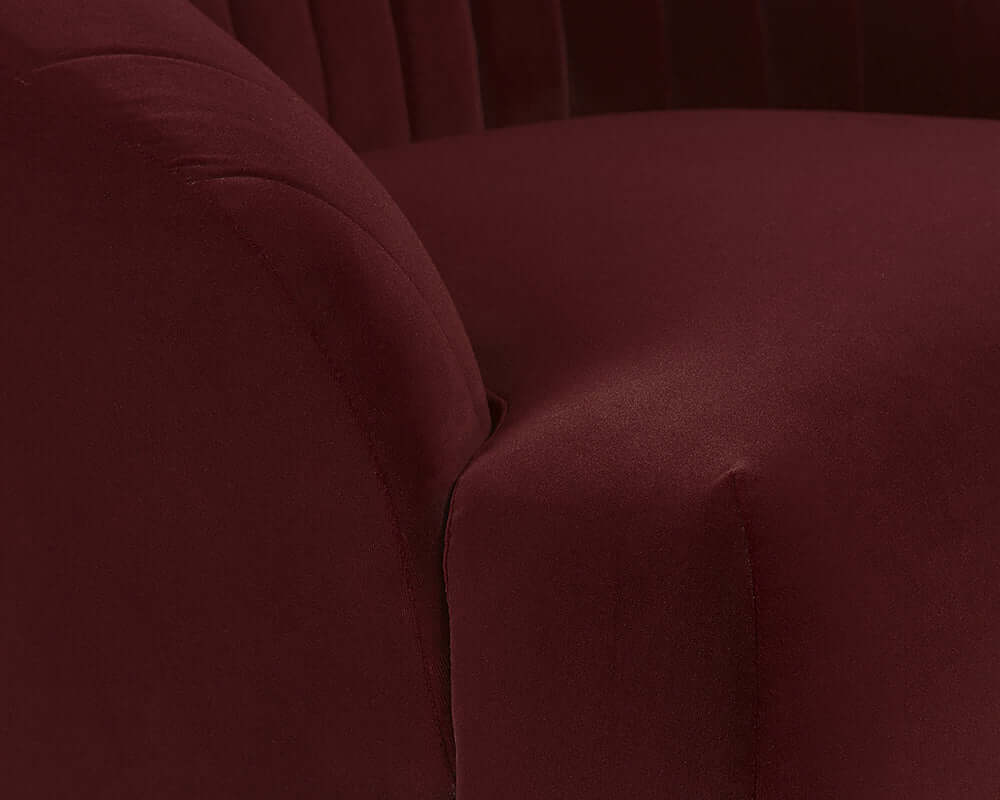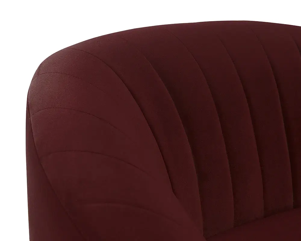 The beautiful lines of this chair will make a bold and comfortable statement in any space. Features a curved seatback with channel tufting in velvet merlot fabric. Finished with an antique brass iron frame.