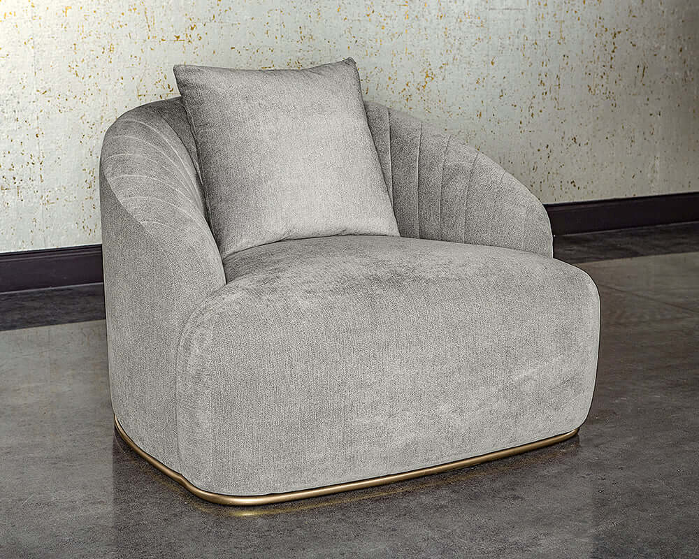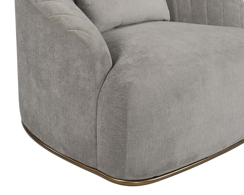 The beautiful lines of this chair will make a bold and comfortable statement in any space. Features a curved seatback with channel tufting in polo club stone performance fabric. Finished with an antique brass steel frame. Performance fabric is moisture repellent, stain resistant and easy to clean.