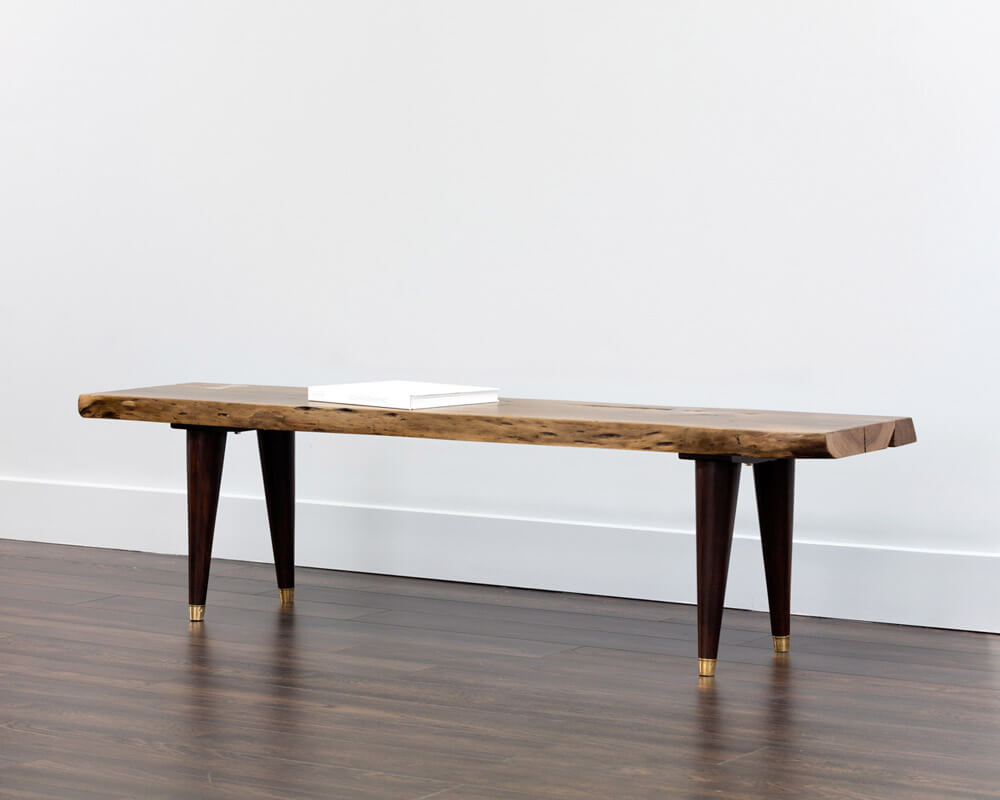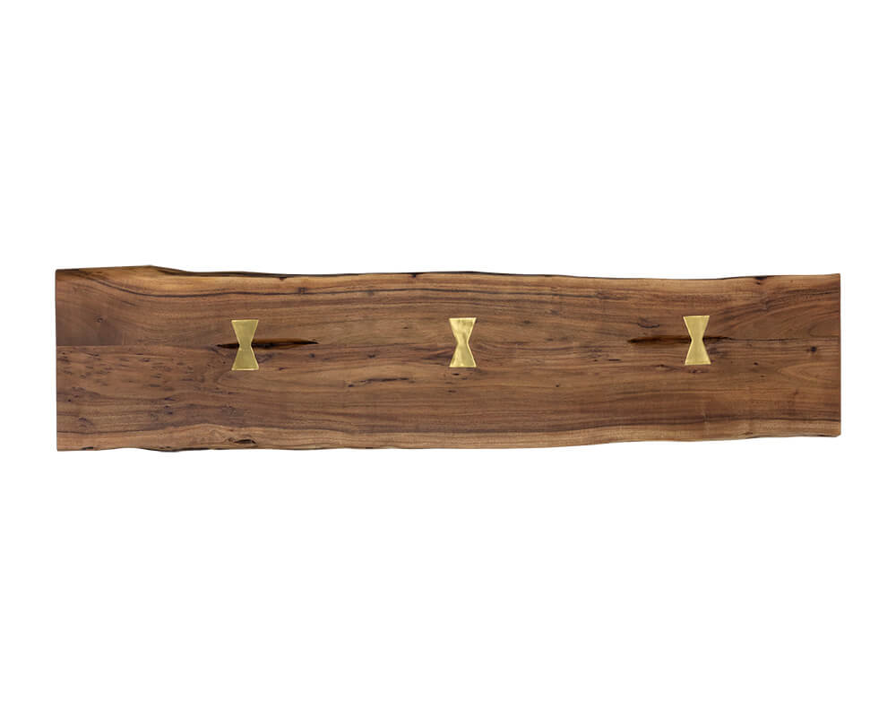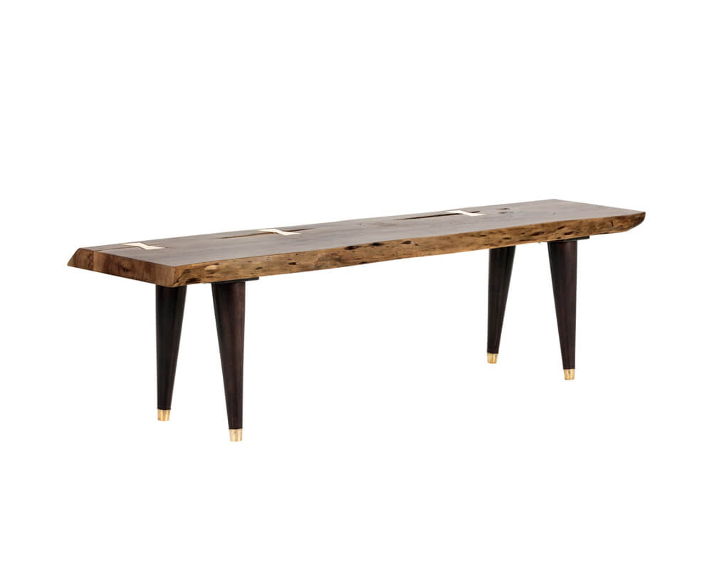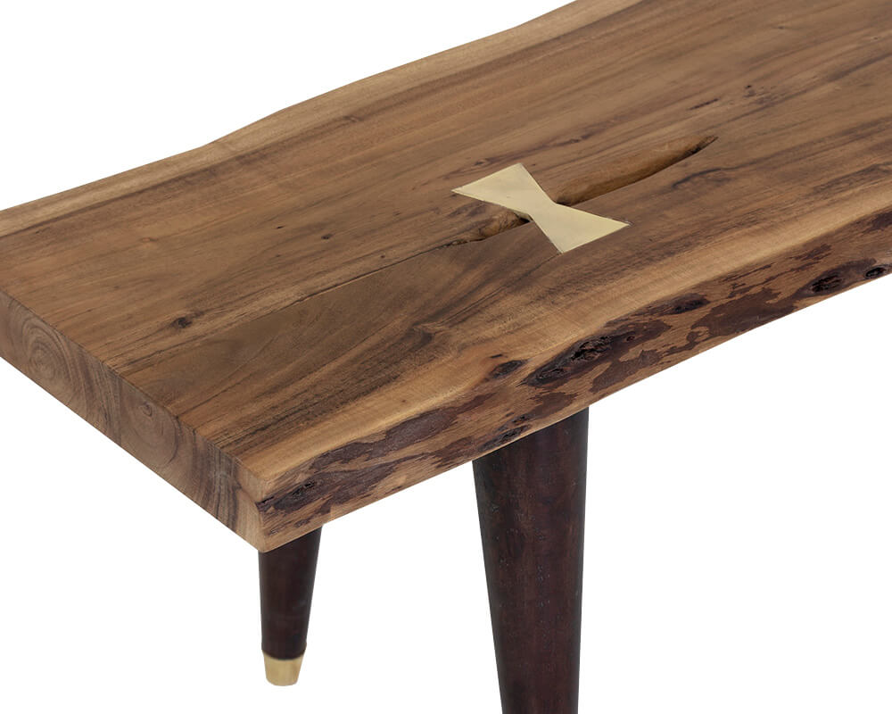 Beautifully crafted in India from natural acacia wood, this live edge bench with brass butterfly joints will add dimension to various foyers and seating areas. Tapered medium brown acacia wood legs with brass steel caps complete the look. Each top will vary in size and shape for a truly unique piece.