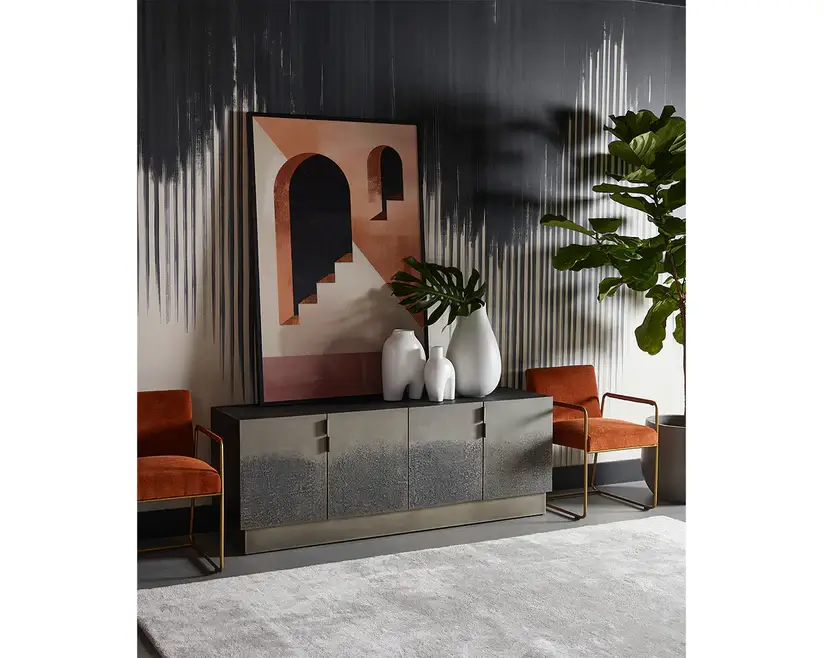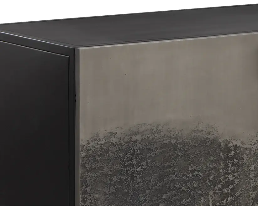 Carefully crafted by Indian artisans, the Caddo Sideboard balances practicality and style. Four textured antique nickel aluminum doors reveal ample storage for all your essentials. A black powder-coated iron frame finishes off the look.
