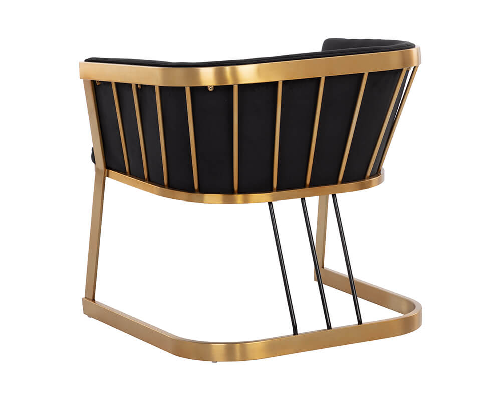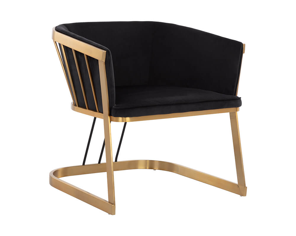Elegant and modern style unite in this beautiful lounge chair. Stocked in abbington black fabric with a brushed gold stainless steel cage-like, cantilever frame. Contrast black steel legs complete the look.