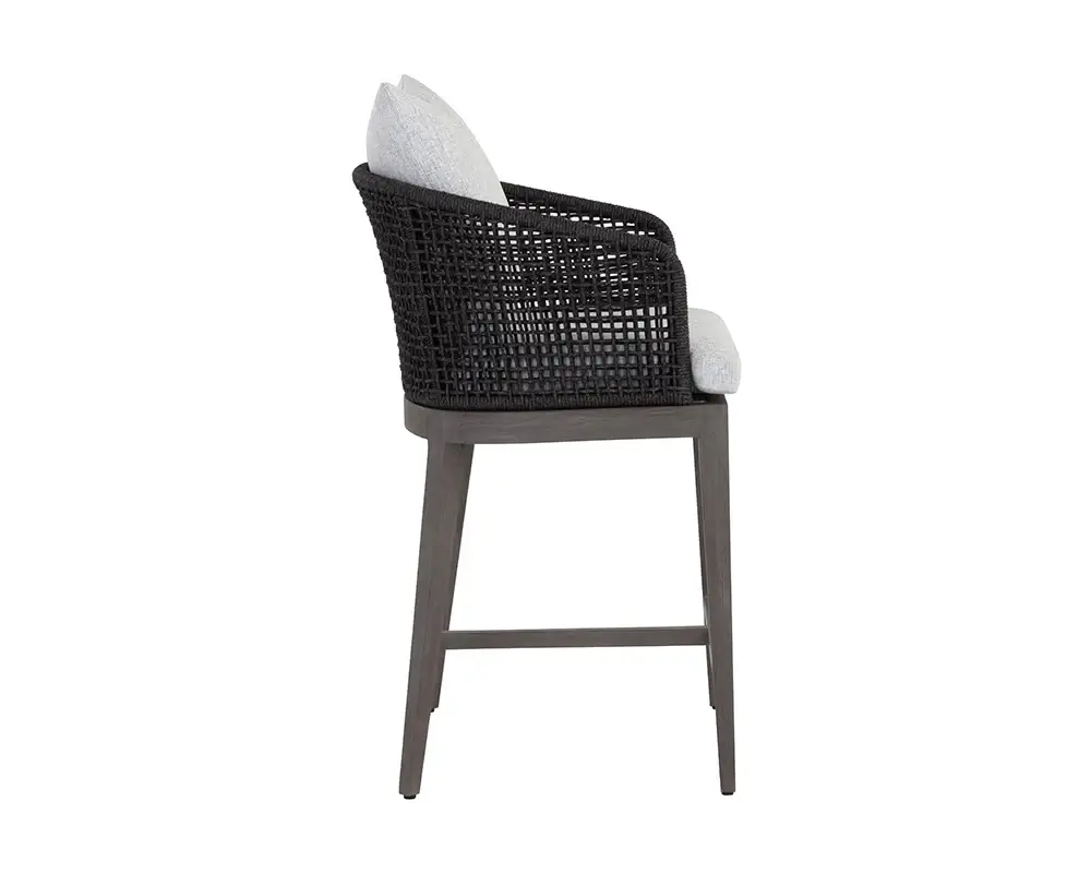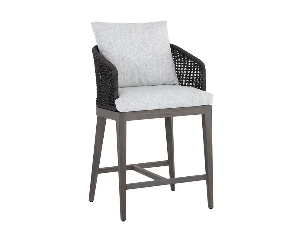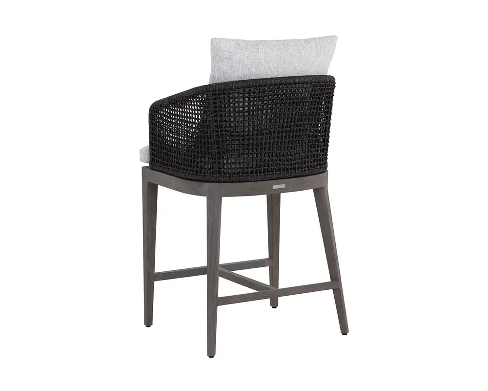 Blur the lines of inside and out with this beautiful outdoor counter stool. This comfortable design features a barrel back frame wrapped in dark greymix weave and seat cushions in copacabana marble fabric. A smoked grey teak wood base completes the look. Suitable for indoor and covered outdoor spaces.
