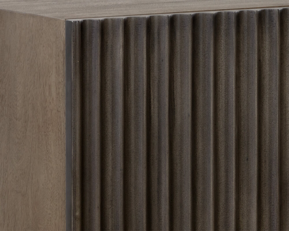 This bold sideboard will command attention through living, lounge and dining spaces. Features a grey mango wood frame with dramatic sculpted details on the face of the two cabinets. Steel legs complete the urban and contemporary look. Made in India. With refined craftsmanship, this design was brought to life by skilled local artisans. By nature, these materials develop unique imperfections such as fissures, markings and colour variations for a truly one-of-a-kind piece.