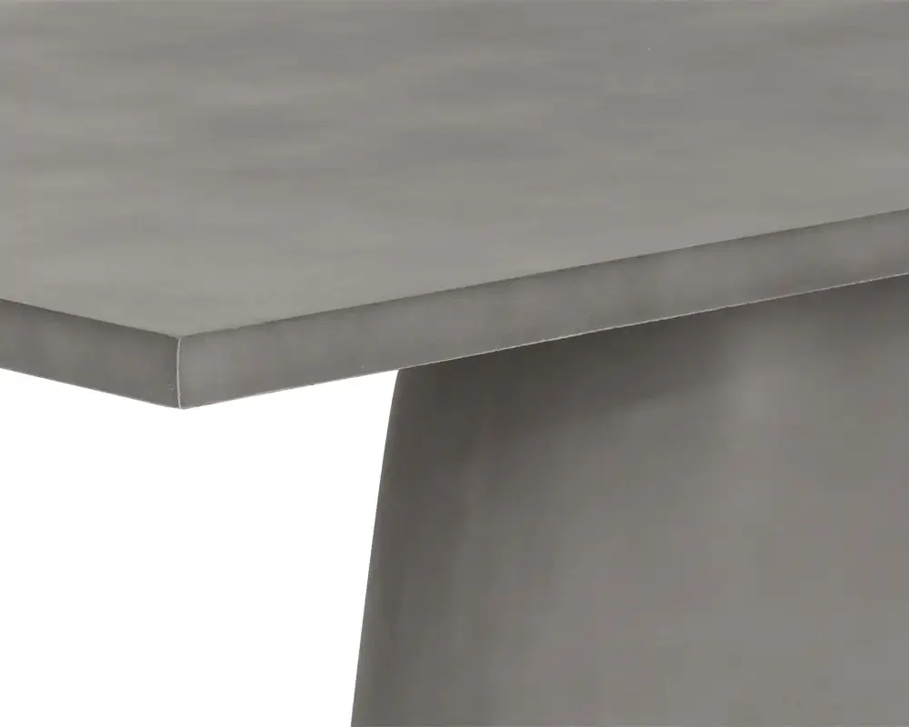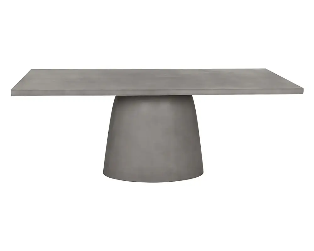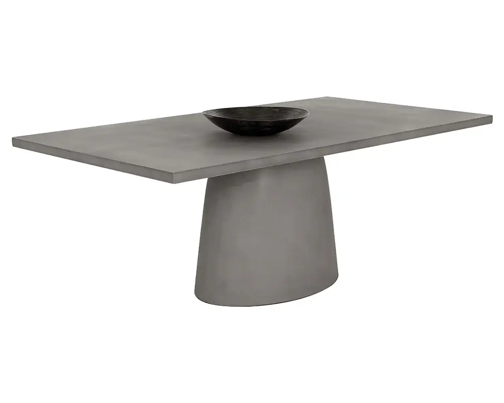 A grand dining table that features a sleek and contemporary design that is guaranteed to elevate any dining space. Features a rectangular tabletop with an oval base.